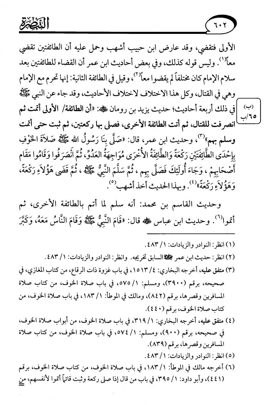 (¬6) أخرجه مالك في الموطأ: 1/ 183، في باب صلاة الخوف من كتاب صلاة الخوف، برقم (441)، وأبو داود: 1/ 395، في باب من قال إذا صلى ركعة وثبت قائمًا أتموا لأنفسهم، من =