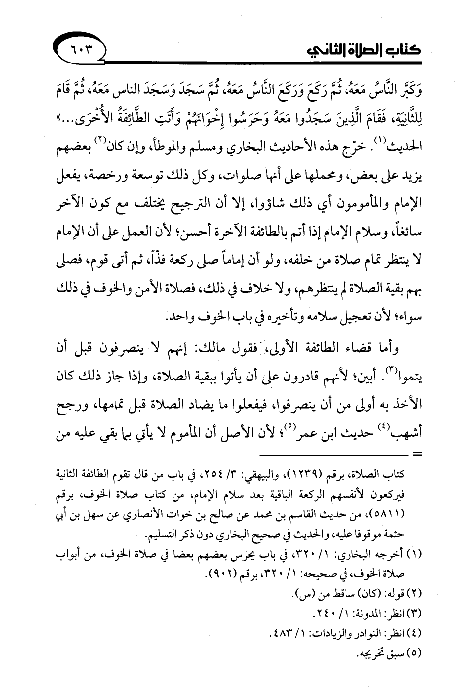 = كتاب الصلاة، برقم (1239)، والبيهقي: 3/ 254، في باب من قال تقوم الطائفة الثانية فيركعون لأنفسهم الركعة الباقية بعد سلام الإِمام، من كتاب صلاة الخوف، برقم (5811)، من حديث القاسم بن محمَّد عن صالح بن خوات الأنصاري عن سهل بن أبي حثمة موقوفًا عليه, والحديث في صحيح البخاري دون ذكر التسليم.