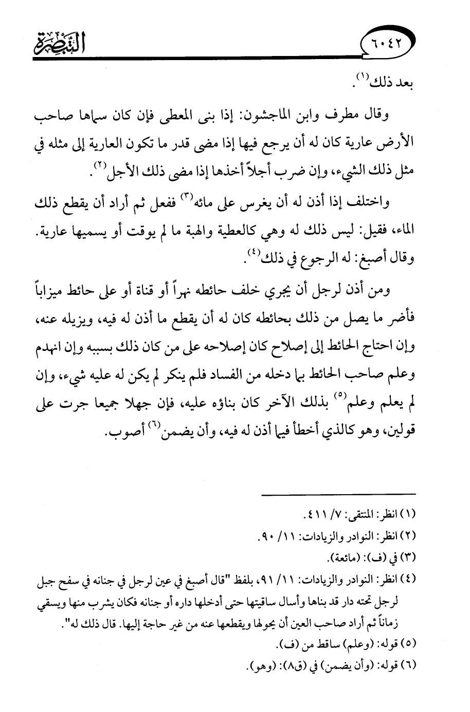 (¬4) انظر: النوادر والزيادات: 11/ 91، بلفظ "قال أصبغ في عين لرجل في جنانه في سفح جبل لرجل تحته دار قد بناها وأسال ساقيتها حتى أدخلها داره أو جنانه فكان يشرب منها ويسقي زمانًا ثم أراد صاحب العين أن يحولها ويقطعها عنه من غير حاجة إليها. قال ذلك له".
