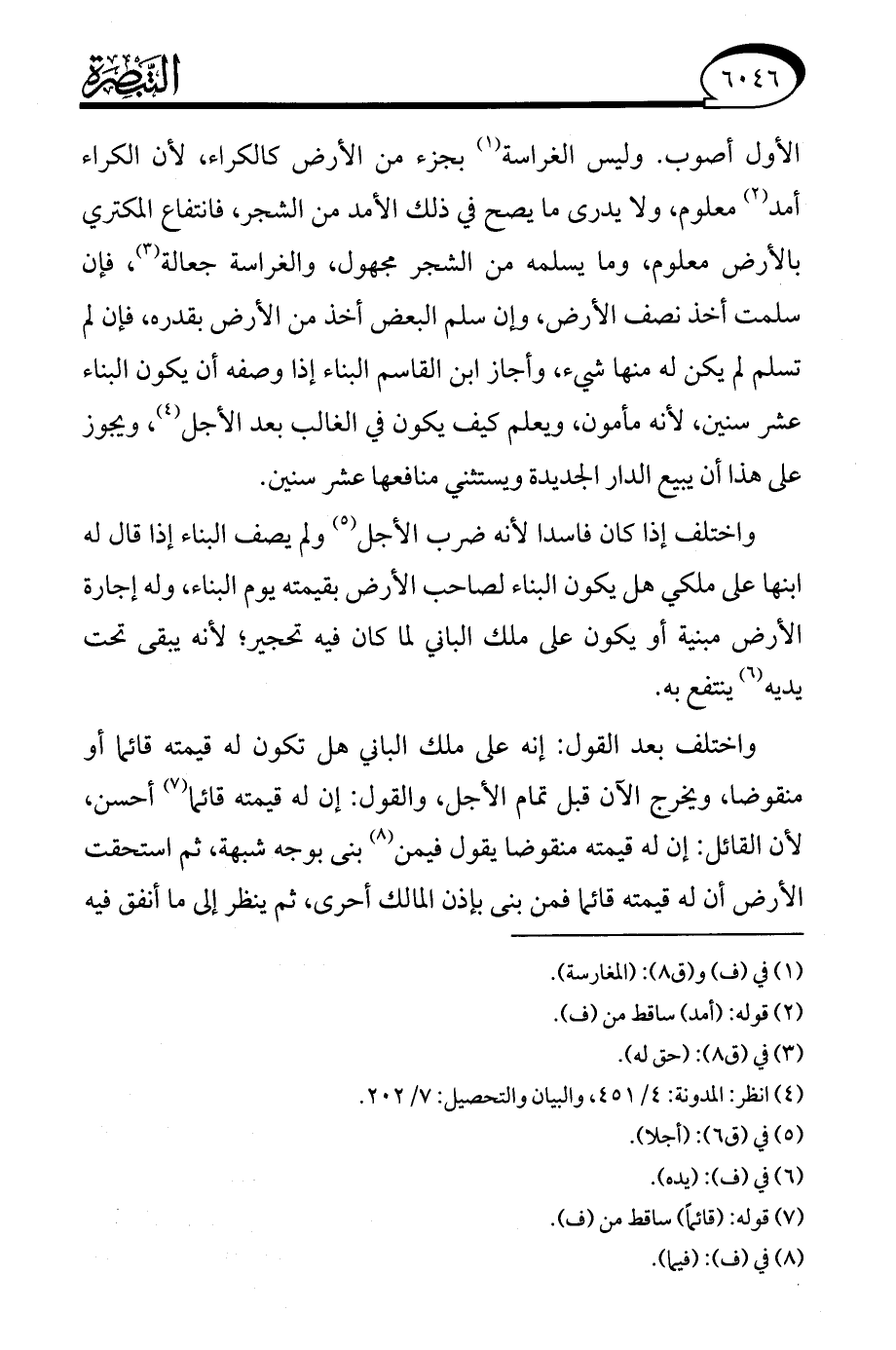 الأول أصوب. وليس الغراسة (¬1) بجزء من الأرض كالكراء؛ لأن الكراء أمد (¬2) معلوم، ولا يدرى ما يصح في ذلك الأمد من الشجر، فانتفاع المكتري بالأرض معلوم، وما يسلمه من الشجر مجهول، والغراسة جعالة (¬3)، فإن سلمت أخذ نصف الأرض، وإن سلم البعض أخذ من الأرض بقدره، فإن لم تسلم لم يكن له منها شيء، وأجاز ابن القاسم البناء إذا وصفه أن يكون البناء عشر سنين؛ لأنه مأمون، ويعلم كيف يكون في الغالب بعد الأجل (¬4)، ويجوز على هذا أن يبيع الدار الجديدة ويستثني منافعها عشر سنين.