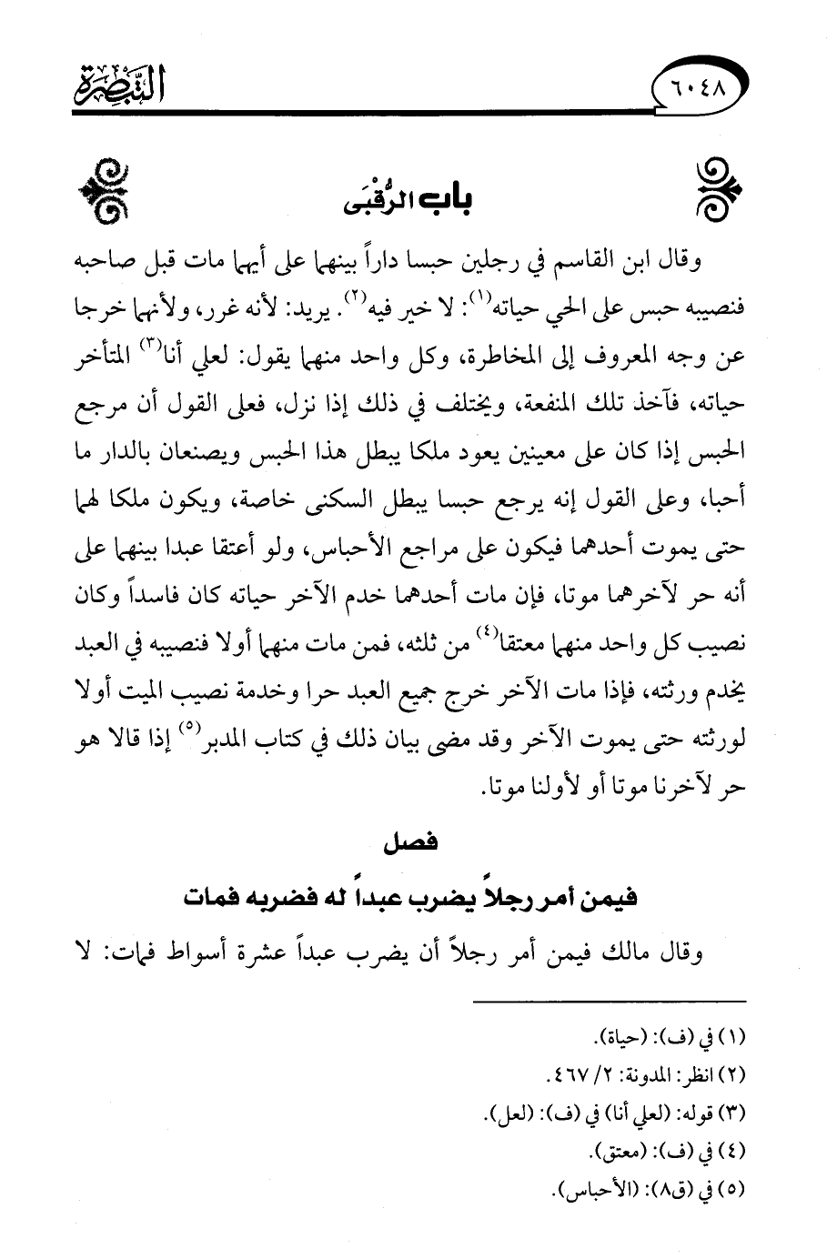 وقال ابن القاسم في رجلين حبسا دارًا بينهما على أيهما مات قبل صاحبه فنصيبه حبس على الحي حياته (¬1): لا خير فيه (¬2). يريد: لأنه غرر، ولأنهما خرجا عن وجه المعروف إلى المخاطرة، وكل واحد منهما يقول: لعلي أنا (¬3) المتأخر حياته، فآخذ تلك المنفعة، ويختلف في ذلك إذا نزل، فعلى القول أن مرجع الحبس إذا كان على معينين يعود ملكا يبطل هذا الحبس ويصنعان بالدار ما أحبا، وعلى القول إنه يرجع حبسا يبطل السكنى خاصة، ويكون ملكا لهما حتى يموت أحدهما فيكون على مراجع الأحباس، ولو أعتقا عبدا بينهما على أنه حر لآخرهما موتا، فإن مات أحدهما خدم الآخر حياته كان فاسدًا وكان نصيب كل واحد منهما معتقا (¬4) من ثلثه، فمن مات منهما أولا فنصيبه في العبد يخدم ورثته، فإذا مات الآخر خرج جميع العبد حرا وخدمة نصيب الميت أولا لورثته حتى يموت الآخر وقد مضى بيان ذلك في كتاب المدبر (¬5) إذا قالا هو حر لآخرنا موتا أو لأولنا موتا.
