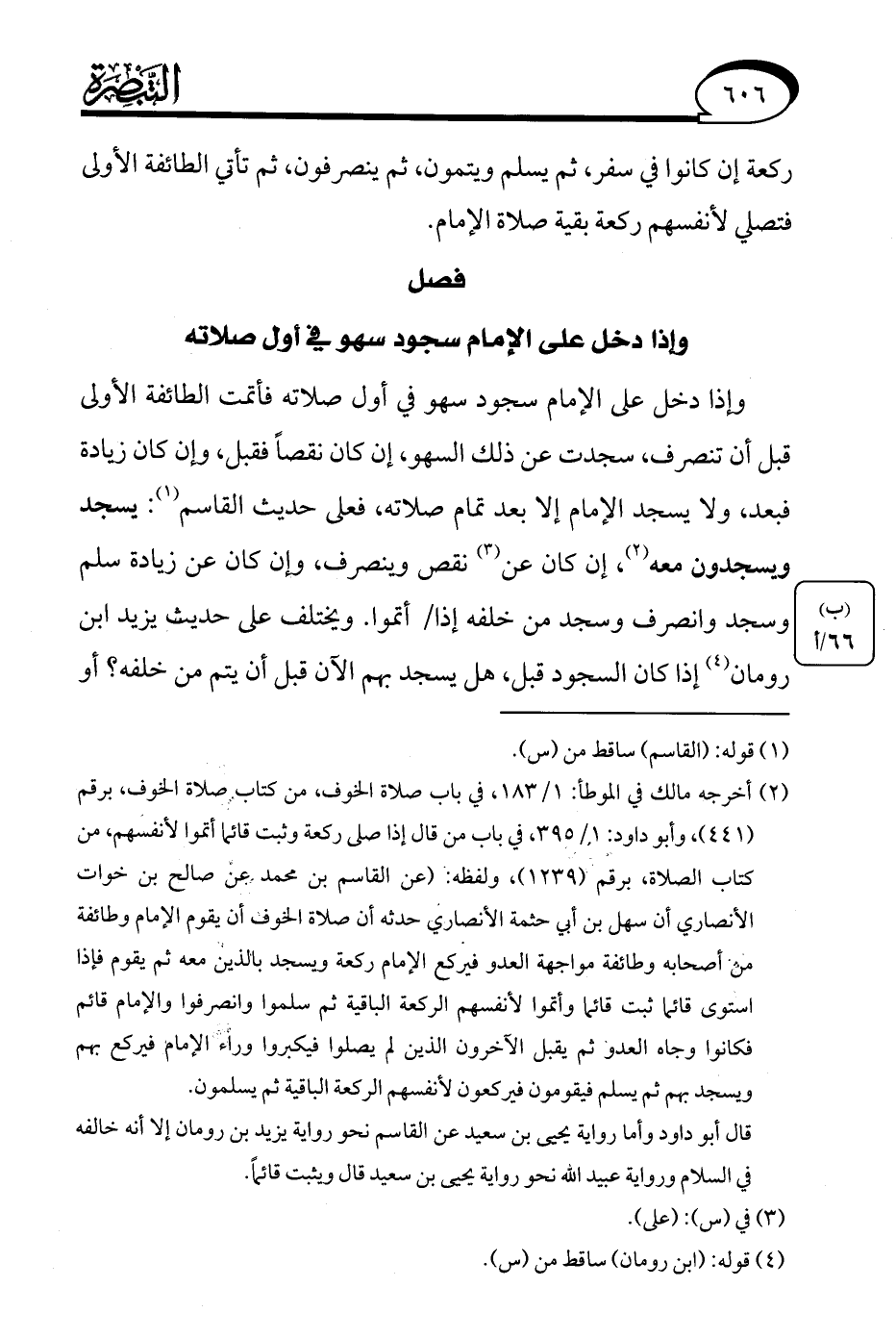 (¬2) أخرجه مالك في الموطأ: 1/ 183، في باب صلاة الخوف، من كتاب، صلاة الخوف، برقم (441)، وأبو داود: 1/ 395، في باب من قال إذا صلى ركعة وثبت قائما أتموا لأنفسهم، من كتاب الصلاة، برقم (1239)، ولفظه: (عن القاسم بن محمد عن صالح بن خوات الأنصاري أن سهل بن أبي حثمة الأنصاري حدثه أن صلاة الخوف أن يقوم الإِمام وطائفة من أصحابه وطائفة مواجهة العدو فيركع الإِمام ركعة ويسجد بالذين معه ثم يقوم فإذا استوى قائما ثبت قائما وأتموا لأنفسهم الركعة الباقية ثم سلموا وانصرفوا والإمام قائم فكانوا وجاه العدو ثم يقبل الآخرون الذين لم يصلوا فيكبروا وراء الإِمام فيركع بهم ويسجد بهم ثم يسلم فيقومون فيركعون لأنفسهم الركعة الباقية ثم يسلمون.