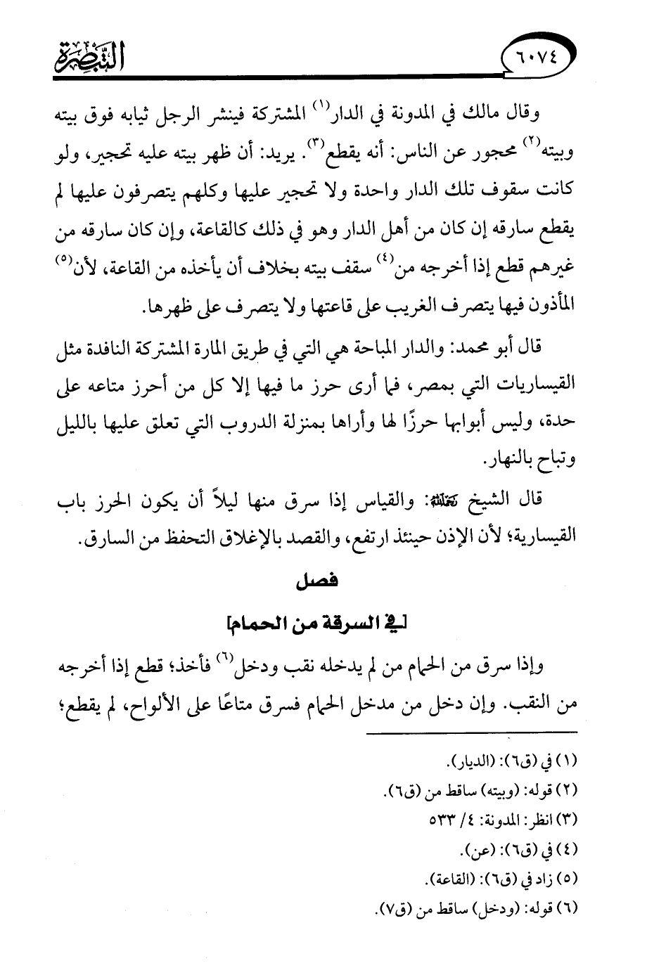 وقال مالك في المدونة في الدار (¬1) المشتركة فينشر الرجل ثيابه فوق بيته وبيته (¬2) محجور عن الناس: أنه يقطع (¬3). يريد: أن ظهر بيته عليه تحجير، ولو كانت سقوف تلك الدار واحدة ولا تحجير عليها وكلهم يتصرفون عليها لم يقطع سارقه إن كان من أهل الدار وهو في ذلك كالقاعة، وإن كان سارقه من غيرهم قطع إذا أخرجه من (¬4) سقف بيته بخلاف أن يأخذه من القاعة؛ لأن (¬5) المأذون فيها يتصرف الغريب على قاعتها ولا يتصرف على ظهرها.