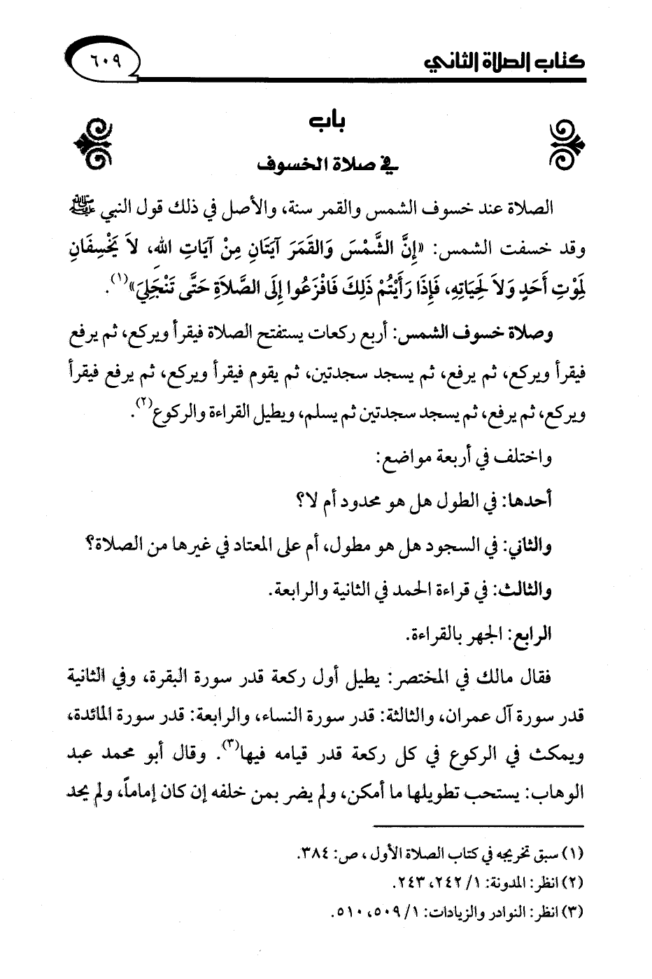 وصلاة خسوف الشمس: أربع ركعات يستفتح الصلاة فيقرأ ويركع، ثم يرفع فيقرأ ويركع، ثم يرفع، ثم يسجد سجدتين، ثم يقوم فيقرأ ويركع، ثم يرفع فيقرأ ويركع، ثم يرفع، ثم يسجد سجدتين ثم يسلم، ويطيل القراءة والركوع (¬2).