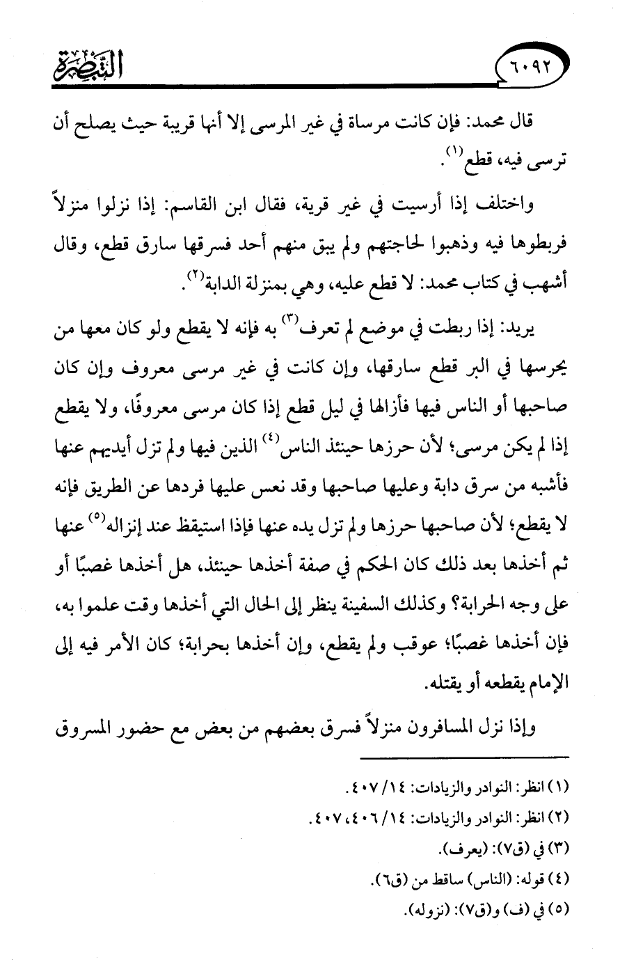 واختلف إذا أرسيت في غير قرية، فقال ابن القاسم: إذا نزلوا منزلًا فربطوها فيه وذهبوا لحاجتهم ولم يبق منهم أحد فسرقها سارق قطع، وقال أشهب في كتاب محمد: لا قطع عليه، وهي بمنزلة الدابة (¬2).