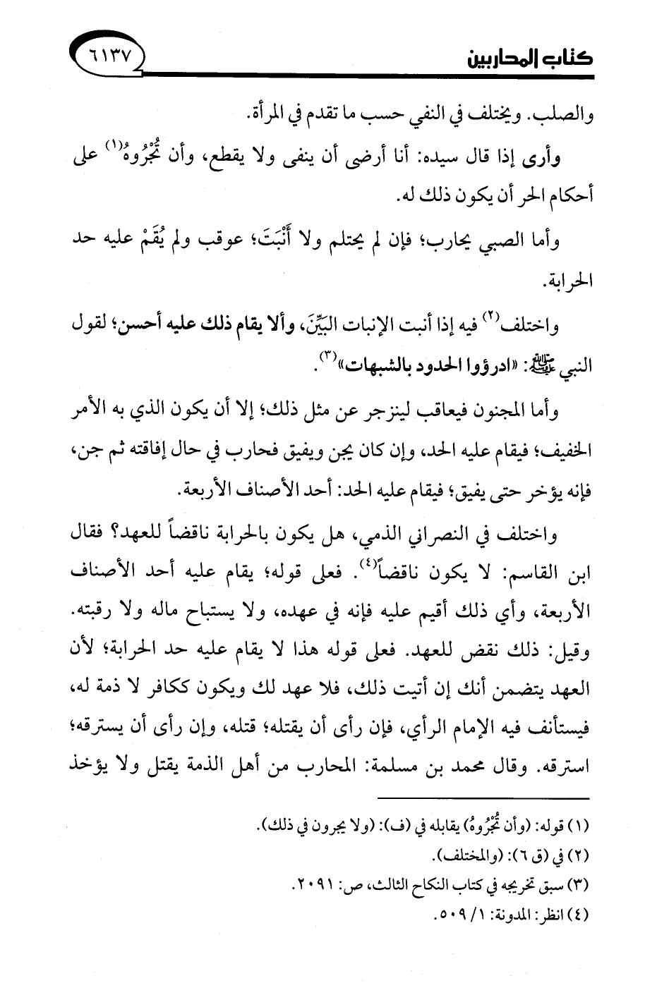 واختلف في النصراني الذمي، هل يكون بالحرابة ناقضًا للعهد؟ فقال ابن القاسم: لا يكون ناقضًا (¬4). فعلى قوله؛ يقام عليه أحد الأصناف الأربعة، وأي ذلك أقيم عليه فإنه في عهده، ولا يستباح ماله ولا رقبته. وقيل: ذلك نقض للعهد. فعلى قوله هذا لا يقام عليه حد الحرابة؛ لأن العهد يتضمن أنك إن أتيت ذلك، فلا عهد لك ويكون ككافر لا ذمة له، فيستأنف فيه الإمام الرأي، فإن رأى أن يقتله، قتله، وإن رأى أن يسترقه، استرقه. وقال محمد بن مسلمة: المحارب من أهل الذمة يقتل ولا يؤخذ