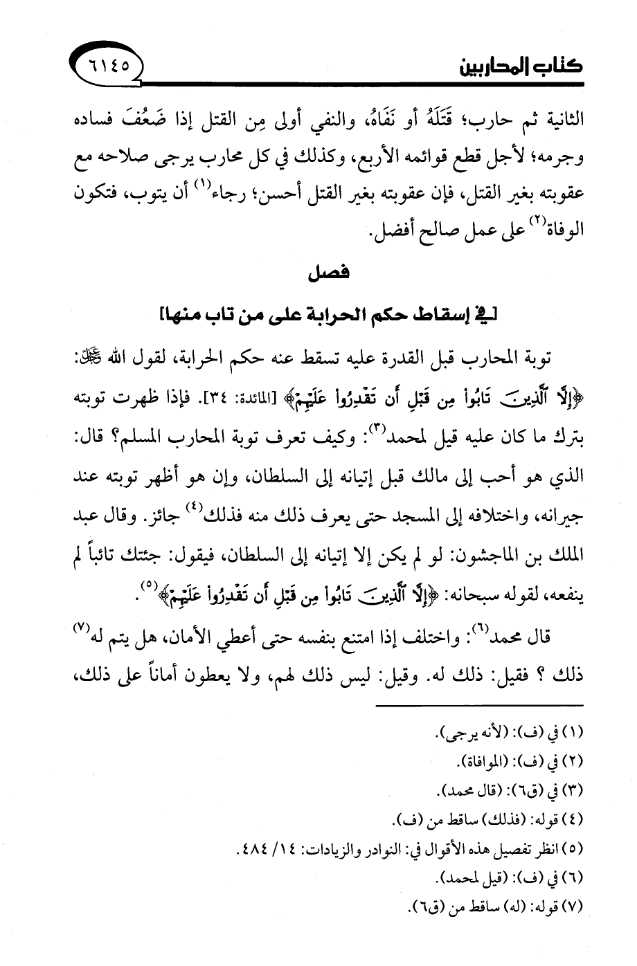 توبة المحارب قبل القدرة عليه تسقط عنه حكم الحرابة، لقول الله -عز وجل-: {إِلَّا الَّذِينَ تَابُوا مِنْ قَبْلِ أَنْ تَقْدِرُوا عَلَيْهِمْ} [المائدة: 34]. فإذا ظهرت توبته بترك ما كان عليه قيل لمحمد (¬3): وكيف تعرف توبة المحارب المسلم؟ قال: الذي هو أحب إلى مالك قبل إتيانه إلى السلطان، وإن هو أظهر توبته عند جيرانه، واختلافه إلى المسجد حتى يعرف ذلك منه فذلك (¬4) جائز. وقال عبد الملك بن الماجشون: لو لم يكن إلا إتيانه إلى السلطان، فيقول: جئتك تائبًا لم ينفعه، لقوله سبحانه: {إِلَّا الَّذِينَ تَابُوا مِنْ قَبْلِ أَنْ تَقْدِرُوا عَلَيْهِمْ} (¬5).