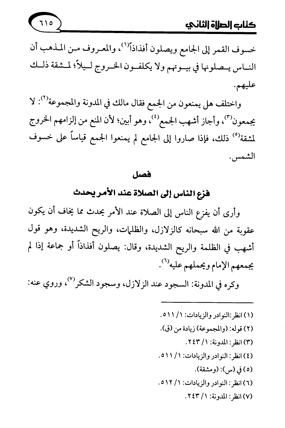 وأرى أن يفزع الناس إلى الصلاة عند الأمر يحدث مما يخاف أن يكون عقوبة من الله سبحانه كالزلازل، والظلمات، والريح الشديدة، وهو قول أشهب في الظلمة والريح الشديدة، وقال: يصلون أفذاذًا أو جماعة إذا لم يجمعهم الإِمام ويحملهم عليه (¬6).