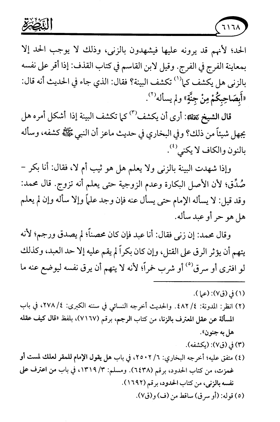(¬2) انظر: المدونة: 4/ 482. والحديث أخرجه النسائي في سننه الكبرى: 4/ 278، في باب المسألة عن عقل المعترف بالزنا، من كتاب الرجم، برقم (7167)، بلفظ "قال كيف عقله هل به جنون".