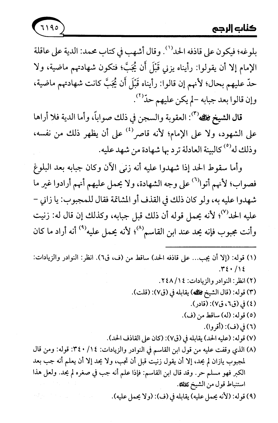 (¬8) الذي وقفت عليه من قول ابن القاسم في النوادر والزيادات: 14/ 340: قوله: ومن قال لمجبوب يازان لم يحد، إلا أن يقول زنيت قبل أن تجب، ولا يحد إلا أن يعلم أنه جب بعد الكبر فهو مسلم حر. وقد قال ابن القاسم: فإذا علم أنه جب في صغره لم يحد. ولعل هذا استنباط قول من الشيخ -رحمه الله-.