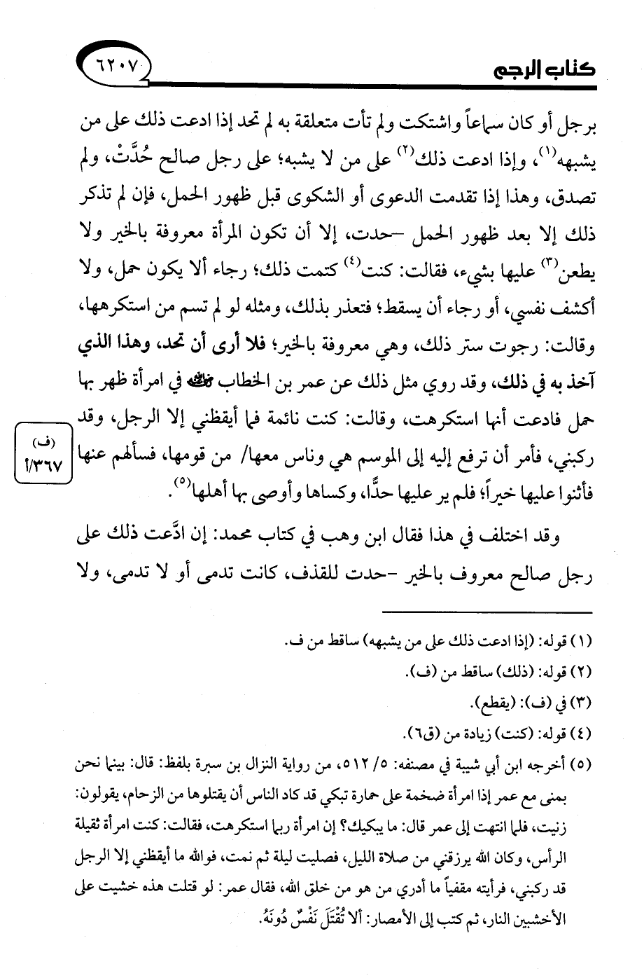 (¬5) أخرجه ابن أبي شيبة في مصنفه: 5/ 512، من رواية النزال بن سبرة بلفظ: قال: بينما نحن بمنى مع عمر إذا امرأة ضخمة على حمارة تبكي قد كاد الناس أن يقتلوها من الزحام، يقولون: زنيت، فلما انتهت إلى عمر قال: ما يبكيك؟ إن امرأة ربما استكرهت، فقالت: كنت امرأة ثقيلة الرأس، وكان الله يرزقني من صلاة الليل، فصليت ليلة ثم نمت، فوالله ما أيقظني إلا الرجل قد ركبني، فرأيته مقفيًا ما أدري من هو من خلق الله، فقال عمر: لو قتلت هذه خشيت على الأخشبين النار، ثم كتب إلى الأمصار: ألا تُقْتَلَ نَفْسٌ دُونَهُ.