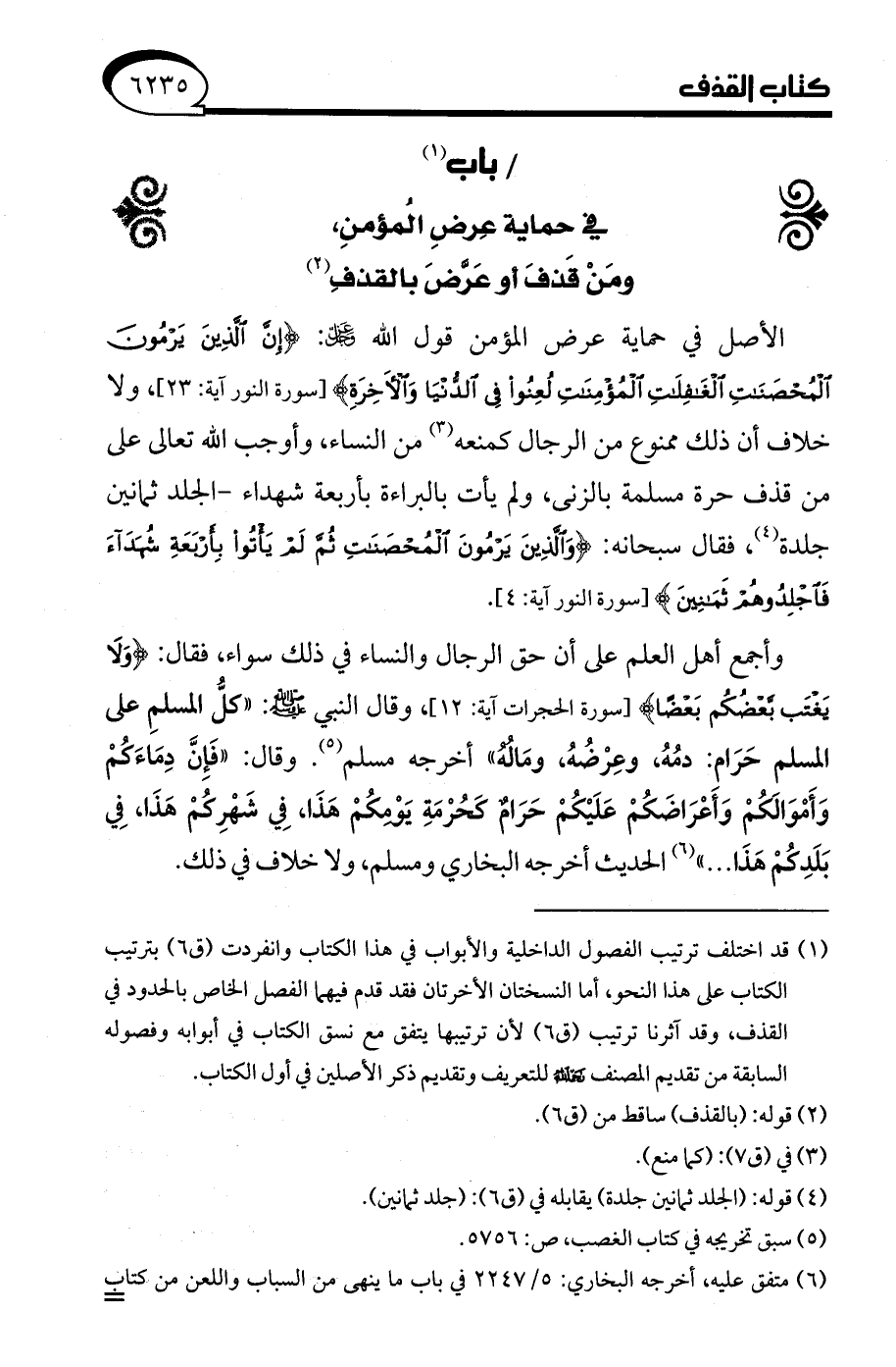(¬1) قد اختلف ترتيب الفصول الداخلية والأبواب في هذا الكتاب وانفردت (ق 6) بترتيب الكتاب على هذا النحو، أما النسختان الأخرتان فقد قدم فيهما الفصل الخاص بالحدود في القذف، وقد آثرنا ترتيب (ق 6) لأن ترتيبها يتفق مع نسق الكتاب في أبوابه وفصوله السابقة من تقديم المصنف -رحمه الله- للتعريف وتقديم ذكر الأصلين في أول الكتاب.