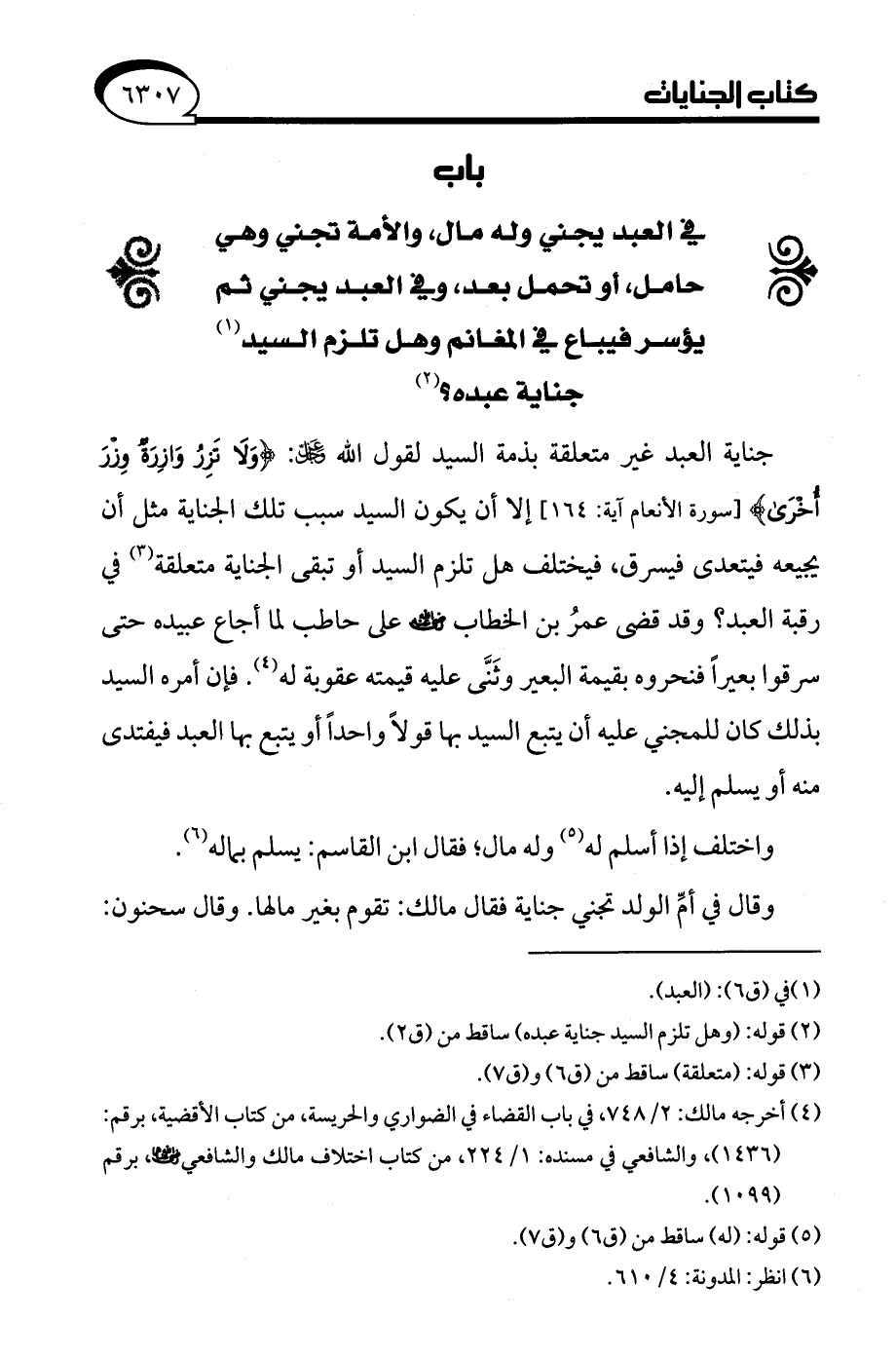 جناية العبد غير متعلقة بذمة السيد لقول الله -عز وجل-: {وَلَا تَزِرُ وَازِرَةٌ وِزْرَ أُخْرَى} [سورة الأنعام آية: 164] إلا أن يكون السيد سبب تلك الجناية مثل أن يجيعه فيتعدى فيسرق، فيختلف هل تلزم السيد أو تبقى الجناية متعلقة (¬3) في رقبة العبد؟ وقد قضى عمرُ بن الخطاب - رضي الله عنه - على حاطب لما أجاع عبيده حتى سرقوا بعيرًا فنحروه بقيمة البعير وثَنَّى عليه قيمته عقوبة له (¬4). فإن أمره السيد بذلك كان للمجني عليه أن يتبع السيد بها قولًا واحدًا أو يتبع بها العبد فيفتدى منه أو يسلم إليه.