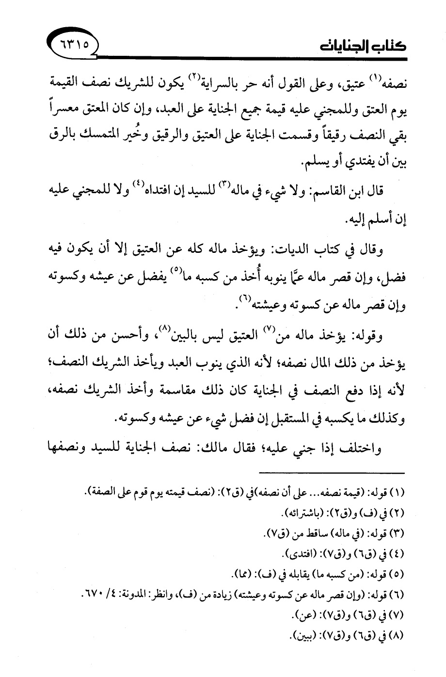 وقوله: يؤخذ ماله من (¬7) العتيق ليس بالبين (¬8)، وأحسن من ذلك أن يؤخذ من ذلك المال نصفه؛ لأنه الذي ينوب العبد ويأخذ الشريك النصف؛ لأنه إذا دفع النصف في الجناية كان ذلك مقاسمة وأخذ الشريك نصفه، وكذلك ما يكسبه في المستقبل إن فضل شيء عن عيشه وكسوته.