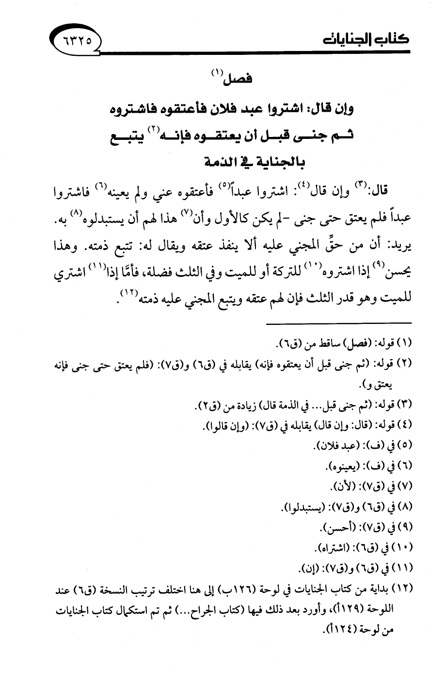 (¬12) بداية من كتاب الجنايات في لوحة (126 ب) إلى هنا اختلف ترتيب النسخة (ق 6) عند اللوحة (129 أ)، وأورد بعد ذلك فيها (كتاب الجراح. . .) ثم تم استكمال كتاب الجنايات من لوحة (124 أ).