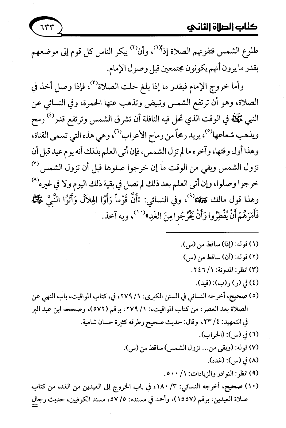 وأما خروج الإِمام فبقدر ما إذا بلغ حلت الصلاة (¬3)، فإذا وصل أخذ في الصلاة، وهو أن ترتفع الشمس وتبيض وتذهب عنها الحمرة، وفي النسائي عن النبي - صلى الله عليه وسلم - في الوقت الذي تحل فيه النافلة أن تشرق الشمس وترتفع قدر (¬4) رمح ويذهب شعاعها (¬5)، يريد رمحًا من رماح الأعراب (¬6)، وهي هذه التي تسمى القناة، وهذا أول وقتها، وآخره ما لم تزل الشمس، فإن أتى العلم بذلك أنه يوم عيد قبل أن تزول الشمس وبقي من الوقت ما إن خرجوا صلوها قبل أن تزول الشمس (¬7) خرجوا وصلوا، وإن أتى العلم بعد ذلك لم تصل في بقية ذلك اليوم ولا في غيره (¬8) وهذا قول مالك -رحمه الله- (¬9)، وفي النسائي: "أَنَّ قَوْمًا رَأَوُا الهِلاَلَ وَأَتَوُا النَّبِيَّ - صلى الله عليه وسلم - فَأَمَرَهُمْ أَنْ يُفْطِرُوا وَأَنْ يَخْرُجُوا مِنَ الغَدِ" (¬10)، وبه آخذ.