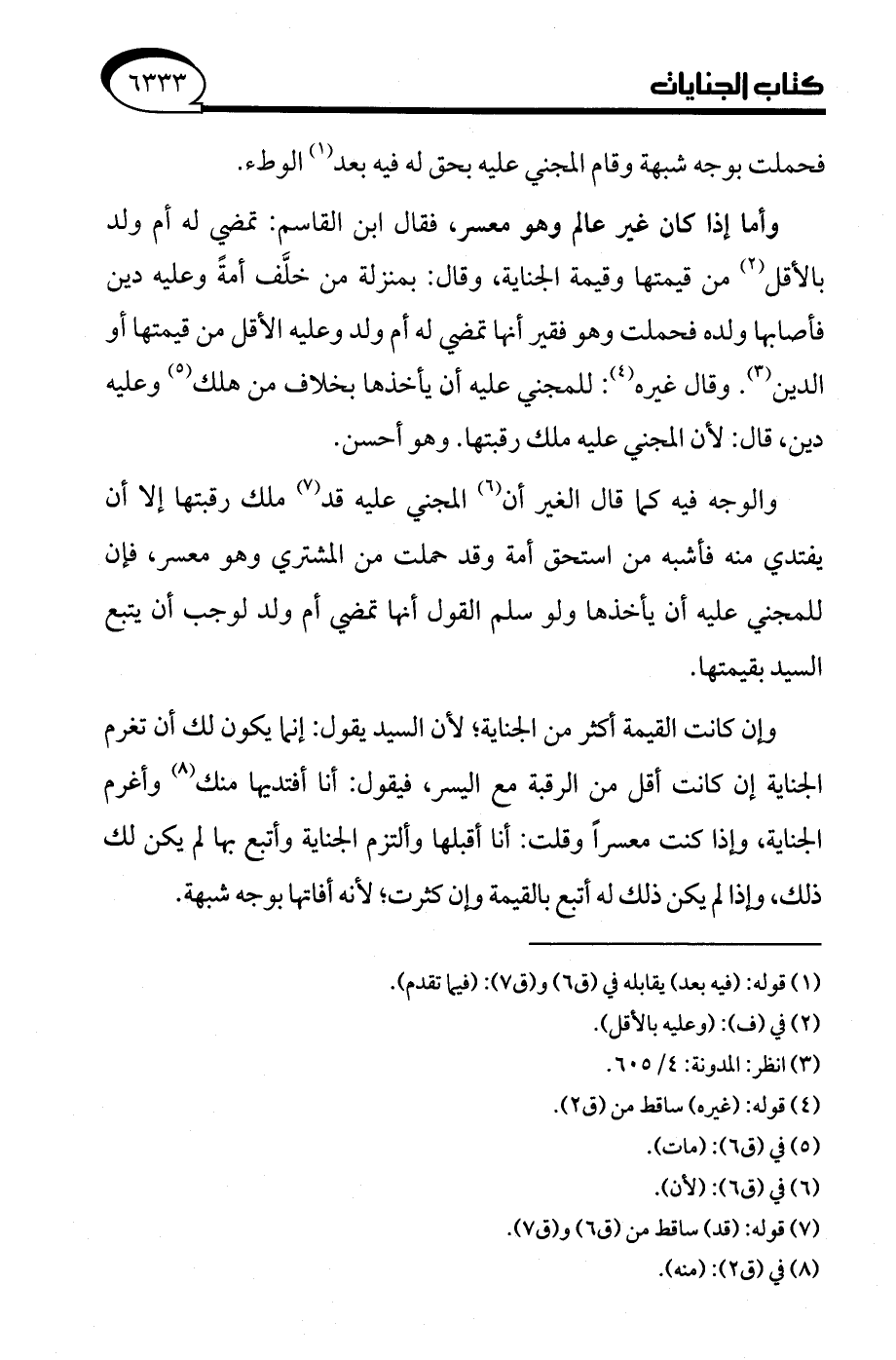 وأما إذا كان غير عالم وهو معسر، فقال ابن القاسم: تمضي له أم ولد بالأقل (¬2) من قيمتها وقيمة الجناية، وقال: بمنزلة من خلَّف أمةً وعليه دين فأصابها ولده فحملت وهو فقير أنها تمضي له أم ولد وعليه الأقل من قيمتها أو الدين (¬3). وقال غيره (¬4): للمجني عليه أن يأخذها بخلاف من هلك (¬5) وعليه دين، قال: لأن المجني عليه ملك رقبتها. وهو أحسن.