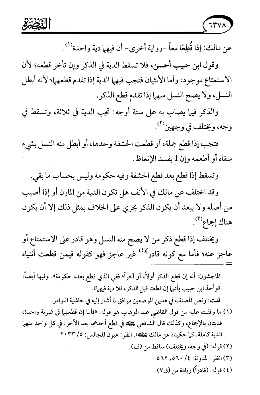 = الماجشون: أنه إن قطع الذكر أولًا، أو آخرًا، ففي الذي قطع بعد، حكومة". وفيها أيضًا: "وأخذ ابن حبيب بأنهما إن قطعتا قبل الذكر، فلا دية فيهما".