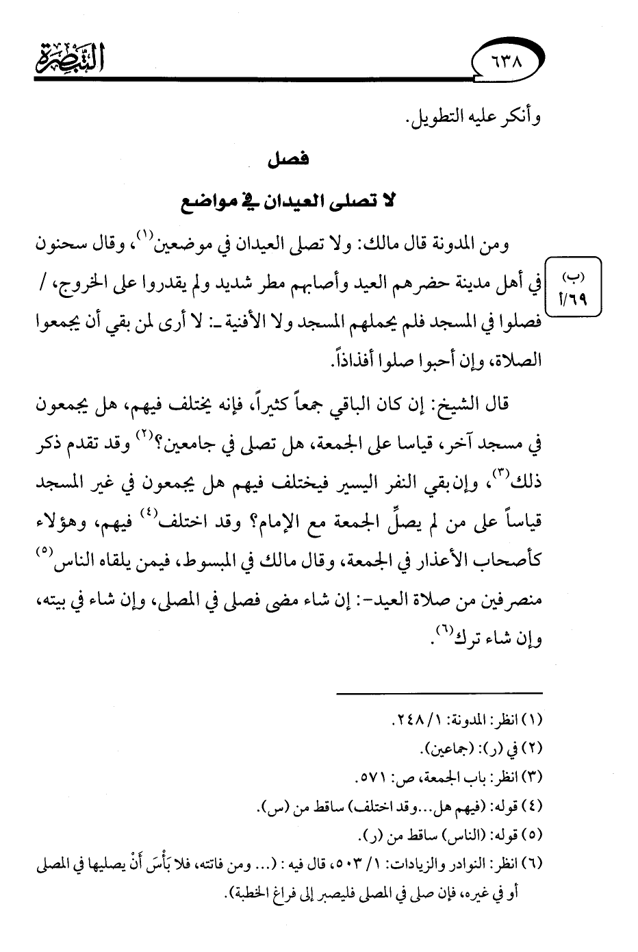 (¬6) انظر: النوادر والزيادات: 1/ 503، قال فيه: (. . . ومن فاتته، فلا بَأْسَ أَنْ يصليها في المصلى أو في غيره، فإن صلى في المصلى فليصبر إلى فراغ الخطبة).