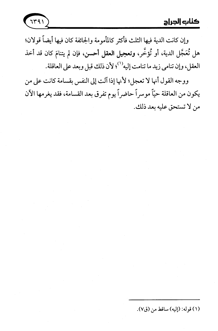 وإن كانت الدية فيها الثلث فأكثر كالمأمومة والجائفة كان فيها أيضًا قولان، هل تُعَجَّل الدية، أو تُؤخَّر، وتعجيل العقل أحسن، فإن لم يتنامَ كان قد أخذ العقل، وإن تنامى زيد ما تنامت إليه (¬1)؛ لأن ذلك قبل وبعد على العاقلة.