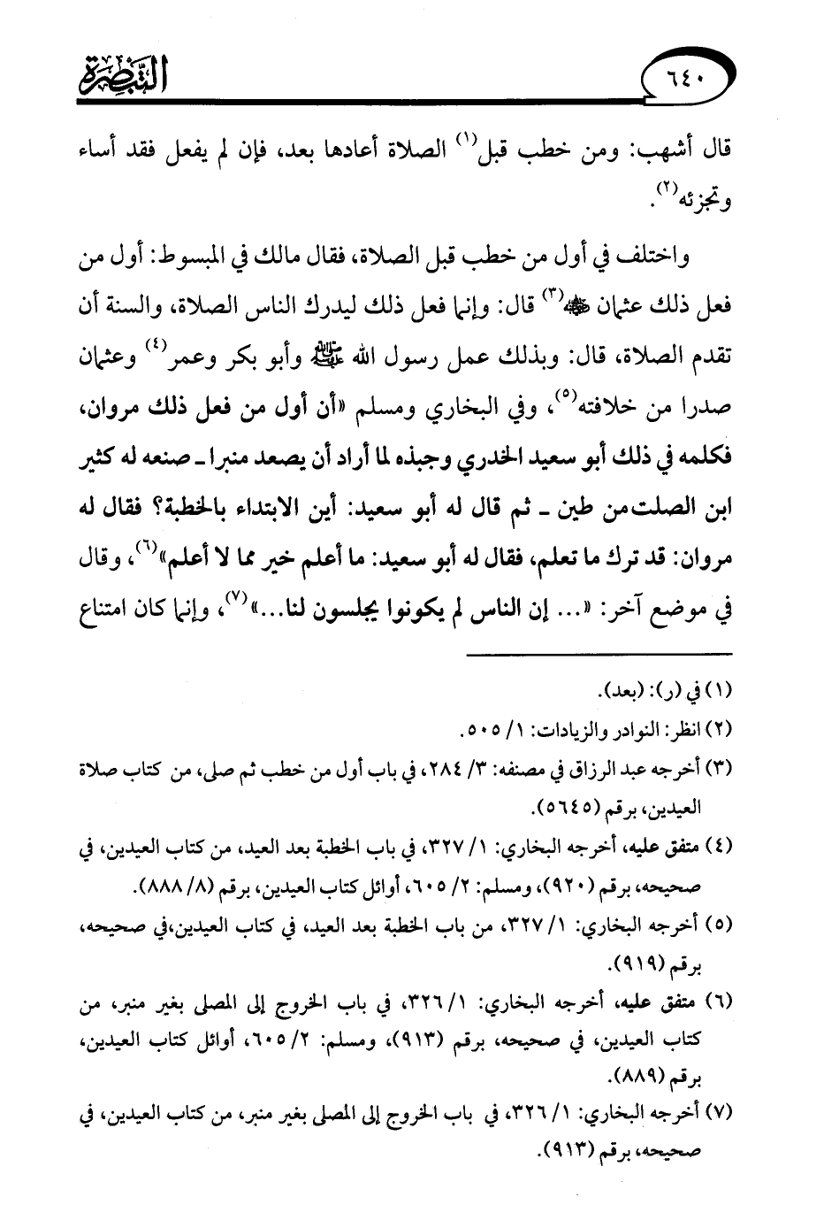 واختلف في أول من خطب قبل الصلاة، فقال مالك في المبسوط: أول من فعل ذلك عثمان - رضي الله عنه - (¬3) قال: وإنما فعل ذلك ليدرك الناس الصلاة، والسنة أن تقدم الصلاة، قال: وبذلك عمل رسول الله - صلى الله عليه وسلم - وأبو بكر وعمر (¬4) وعثمان صدرا من خلافته (¬5)، وفي البخاري ومسلم "أن أول من فعل ذلك مروان، فكلمه في ذلك أبو سعيد الخدري وجبذه لما أراد أن يصعد منبرا -صنعه له كثير ابن الصلت من طين- ثم قال له أبو سعيد: أين الابتداء بالخطبة؟ فقال له مروان: قد ترك ما تعلم، فقال له أبو سعيد: ما أعلم خير مما لا أعلم" (¬6)، وقال في موضع آخر: ". . . إن الناس لم يكونوا يجلسون لنا. . ." (¬7)، وإنما كان امتناع