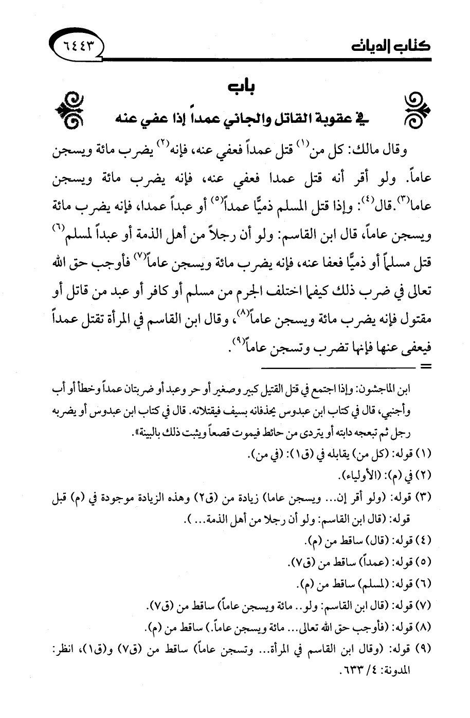 وقال مالك: كل من (¬1) قتل عمدًا فعفي عنه، فإنه (¬2) يضرب مائة ويسجن عامًا. ولو أقر أنه قتل عمدا فعفي عنه، فإنه يضرب مائة ويسجن عاما (¬3). قال (¬4): وإذا قتل المسلم ذميًّا عمدًا (¬5) أو عبدًا عمدا، فإنه يضرب مائة ويسجن عامًا، قال ابن القاسم: ولو أن رجلًا من أهل الذمة أو عبدًا لمسلم (¬6) قتل مسلمًا أو ذميًّا فعفا عنه، فإنه يضرب مائة ويسجن عامًا (¬7) فأوجب حق الله تعالى في ضرب ذلك كيفما اختلف الجرم من مسلم أو كافر أو عبد من قاتل أو مقتول فإنه يضرب مائة ويسجن عامًا (¬8)، وقال ابن القاسم في المرأة تقتل عمدًا فيعفى عنها فإنها تضرب وتسجن عامًا (¬9).