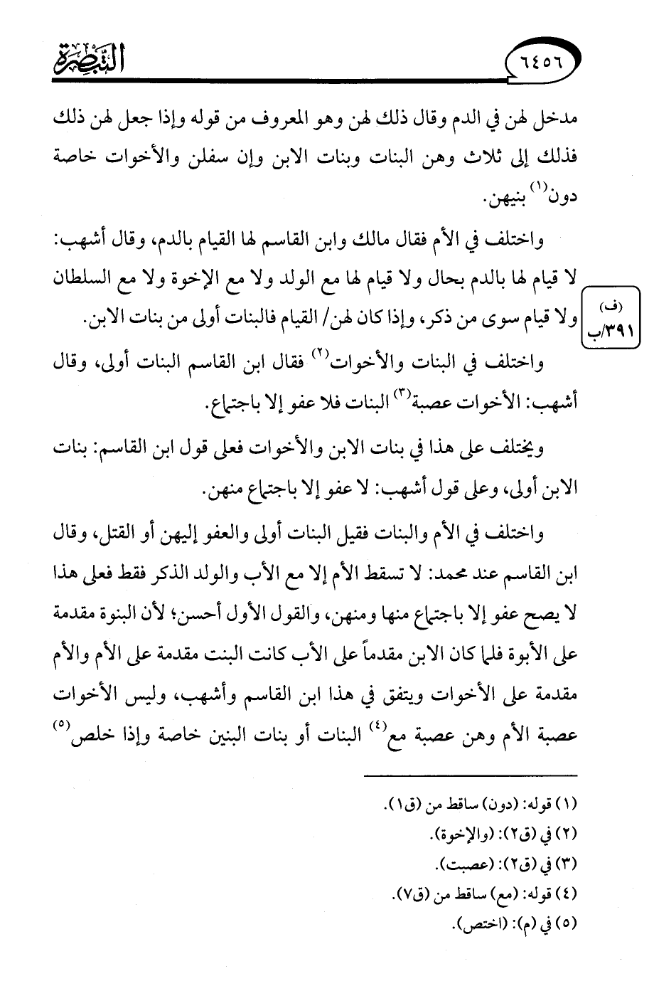 واختلف في الأم والبنات فقيل البنات أولى والعفو إليهن أو القتل، وقال ابن القاسم عند محمد: لا تسقط الأم إلا مع الأب والولد الذكر فقط فعلى هذا لا يصح عفو إلا باجتماع منها ومنهن، والقول الأول أحسن؛ لأن البنوة مقدمة على الأبوة فلما كان الابن مقدمًا على الأب كانت البنت مقدمة على الأم والأم مقدمة على الأخوات ويتفق في هذا ابن القاسم وأشهب، وليس الأخوات عصبة الأم وهن عصبة مع (¬4) البنات أو بنات البنين خاصة وإذا خلص (¬5)