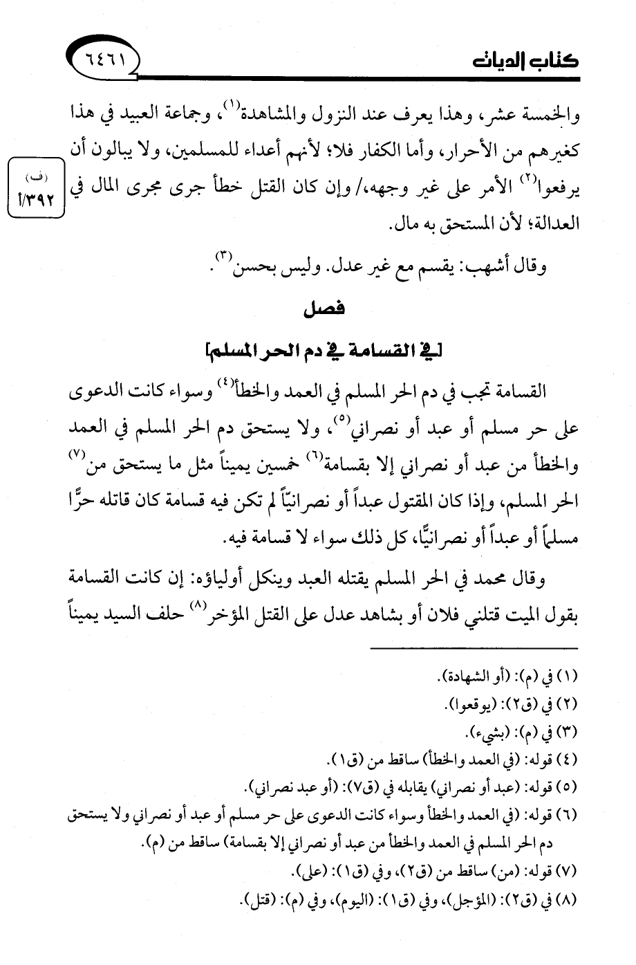 (¬6) قوله: (في العمد والخطأ وسواء كانت الدعوى على حر مسلم أو عبد أو نصراني ولا يستحق دم الحر المسلم في العمد والخطأ من عبد أو نصراني إلا بقسامة) ساقط من (م).