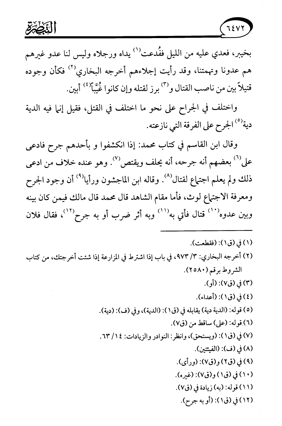بخيبر، فعدي عليه من الليل ففُدعت (¬1) يداه ورجلاه وليس لنا عدو غيرهم هم عدونا وتهمتنا، وقد رأيت إجلاءهم أخرجه البخاري (¬2) فكأن وجوده قتيلًا بين من ناصب القتال و (¬3) برز لقتله وإن كانوا غُيَّبًا (¬4) أبين.
