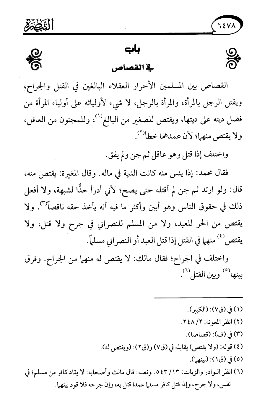 (¬6) انظر النوادر والزيادات: 13/ 543. ونصه: قال مالك وأصحابه: لا يقاد كافر من مسلم، في نفس، ولا جرح، وإذا قتل كافر مسلما عمدا قتل به، وإن جرحه فلا قود بينهما.