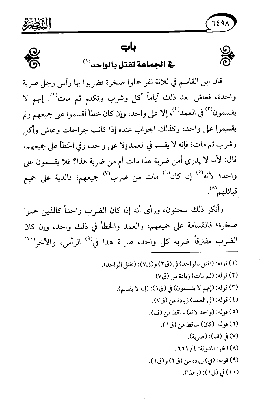 وأنكر ذلك سحنون، ورأى أنه إذا كان الضرب واحدًا كالذين حملوا صخرة، فالقسامة على جميعهم، والعمد والخطأ في ذلك واحد، وإن كان الضرب مفترقًا ضربه كل واحد، ضربة هذا في (¬9) الرأس، والآخر (¬10)