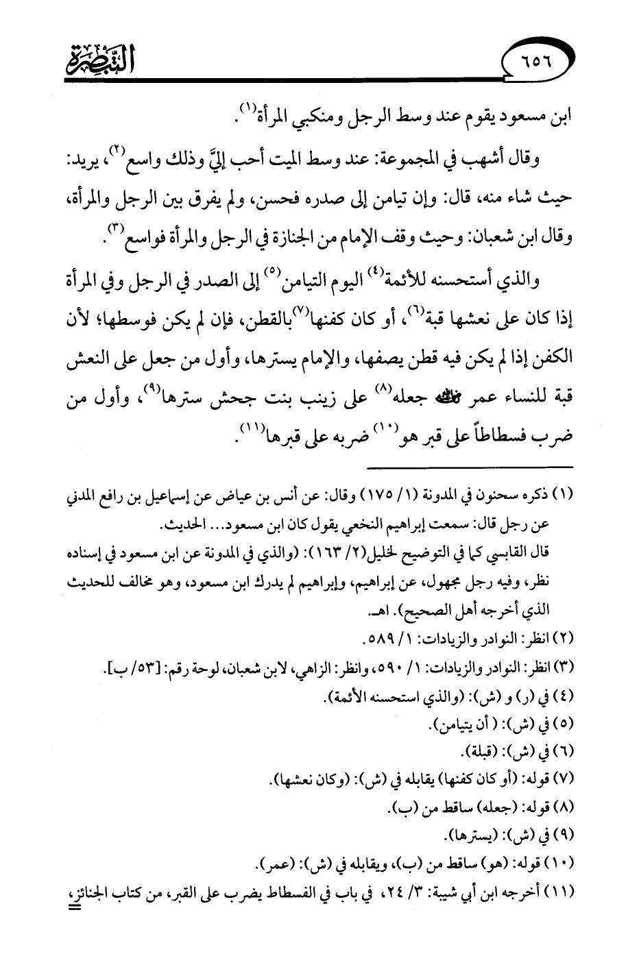 والذي أستحسنه للأئمة (¬4) اليوم التيامن (¬5) إلى الصدر في الرجل وفي المرأة إذا كان على نعشها قبة (¬6)، أو كان كفنها (¬7) بالقطن، فإن لم يكن فوسطها؛ لأن الكفن إذا لم يكن فيه قطن يصفها، والإمام يسترها، وأول من جعل على النعش قبة للنساء عمر - رضي الله عنه - جعله (¬8) على زينب بنت جحش سترها (¬9)، وأول من ضرب فسطاطًا على قبر هو (¬10) ضربه على قبرها (¬11).