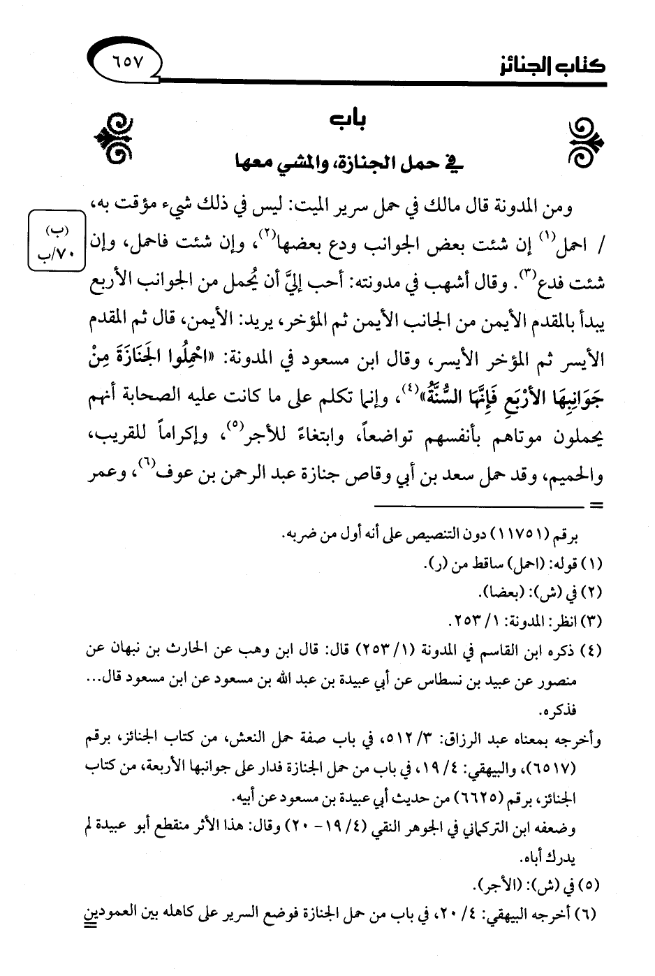 ومن المدونة قال مالك في حمل سرير الميت: ليس في ذلك شيء مؤقت به، احمل (¬1) إن شئت بعض الجوانب ودع بعضها (¬2)، وإن شئت فاحمل، وإن شئت فدع (¬3). وقال أشهب في مدونته: أحب إليَّ أن يُحمل من الجوانب الأربع يبدأ بالمقدم الأيمن من الجانب الأيمن ثم المؤخر، يريد: الأيمن، قال ثم المقدم الأيسر ثم المؤخر الأيسر، وقال ابن مسعود في المدونة: "احْمِلُوا الجَنَازة مِنْ جَوَانِبِهَا الأرْبَعِ فَإِنَّهَا السُّنَّةُ" (¬4)، وإنما تكلم على ما كانت عليه الصحابة أنهم يحملون موتاهم بأنفسهم تواضعًا، وابتغاءً للأجر (¬5)، وإكرامًا للقريب، والحميم، وقد حمل سعد بن أبي وقاص جنازة عبد الرحمن بن عوف (¬6)، وعمر