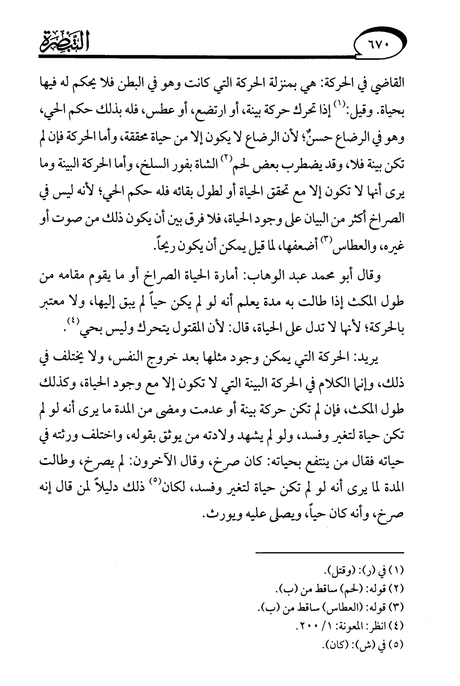 يريد: الحركة التي يمكن وجود مثلها بعد خروج النفس، ولا يختلف في ذلك، وإنما الكلام في الحركة البينة التي لا تكون إلا مع وجود الحياة، وكذلك طول المكث، فإن لم تكن حركة بينة أو عدمت ومضى من المدة ما يرى أنه لو لم تكن حياة لتغير وفسد، ولو لم يشهد ولادته من يوثق بقوله، واختلف ورثته في حياته فقال من ينتفع بحياته: كان صرخ، وقال الآخرون: لم يصرخ، وطالت المدة لما يرى أنه لو لم تكن حياة لتغير وفسد، لكان (¬5) ذلك دليلًا لمن قال إنه صرّح، وأنه كان حيًا، ويصلى عليه ويورث.