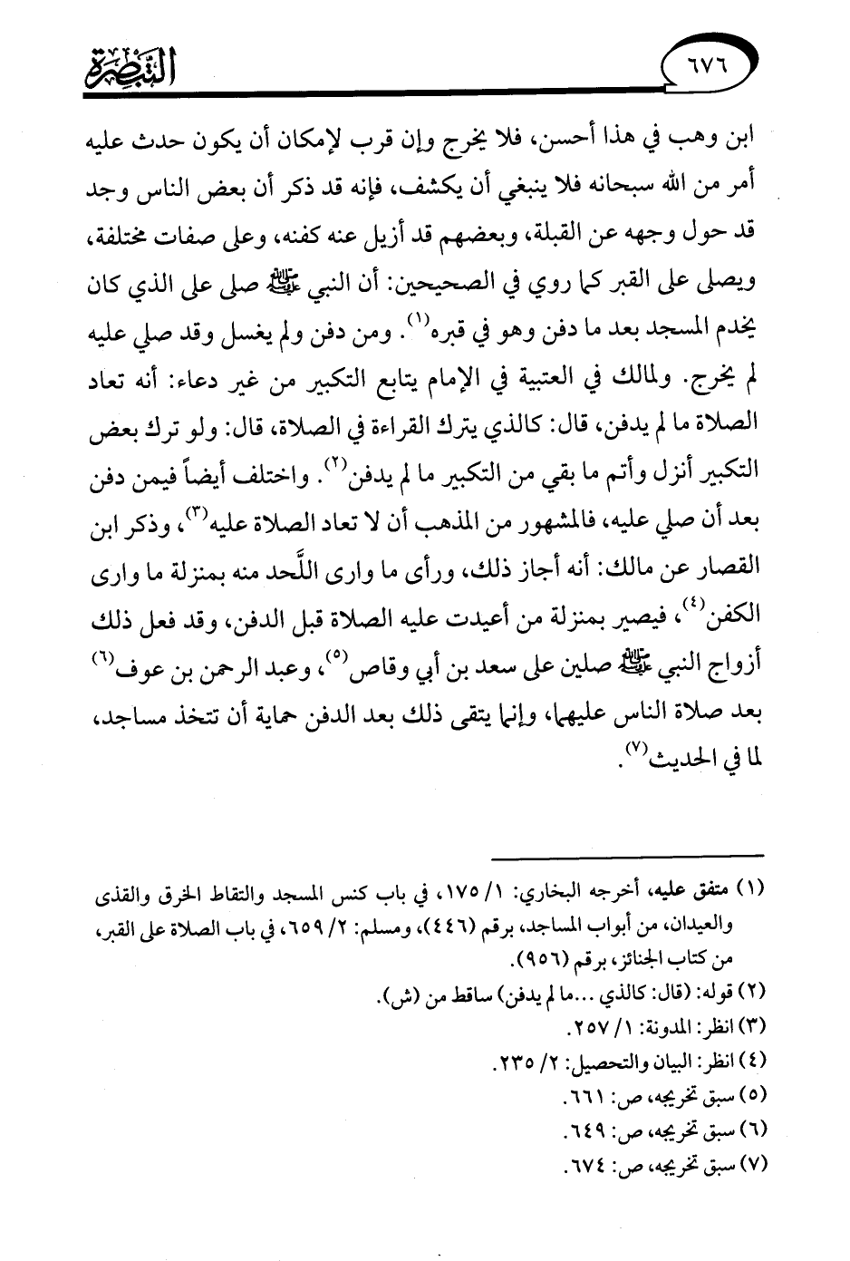 ابن وهب في هذا أحسن، فلا يخرج وإن قرب لإمكان أن يكون حدث عليه أمر من الله سبحانه فلا ينبغي أن يكشف، فإنه قد ذكر أن بعض الناس وجد قد حول وجهه عن القبلة، وبعضهم قد أزيل عنه كفنه، وعلى صفات مختلفة، ويصلى على القبر كما روي في الصحيحين: أن النبي - صلى الله عليه وسلم - صلى على الذي كان يخدم المسجد بعد ما دفن وهو في قبره (¬1). ومن دفن ولم يغسل وقد صلي عليه لم يخرج. ولمالك في العتبية في الإِمام يتابع التكبير من غير دعاء: أنه تعاد الصلاة ما لم يدفن، قال: كالذي يترك القراءة في الصلاة، قال: ولو ترك بعض التكبير أنزل وأتم ما بقي من التكبير ما لم يدفن (¬2). واختلف أيضًا فيمن دفن بعد أن صلي عليه، فالمشهور من المذهب أن لا تعاد الصلاة عليه (¬3)، وذكر ابن القصار عن مالك: أنه أجاز ذلك، ورأى ما وارى اللَّحد منه بمنزلة ما وارى الكفن (¬4)، فيصير بمنزلة من أعيدت عليه الصلاة قبل الدفن، وقد فعل ذلك أزواج النبي - صلى الله عليه وسلم - صلين على سعد بن أبي وقاص (¬5)، وعبد الرحمن بن عوف (¬6) بعد صلاة الناس عليهما، وإنما يتقى ذلك بعد الدفن حماية أن تتخذ مساجد، لما في الحديث (¬7).