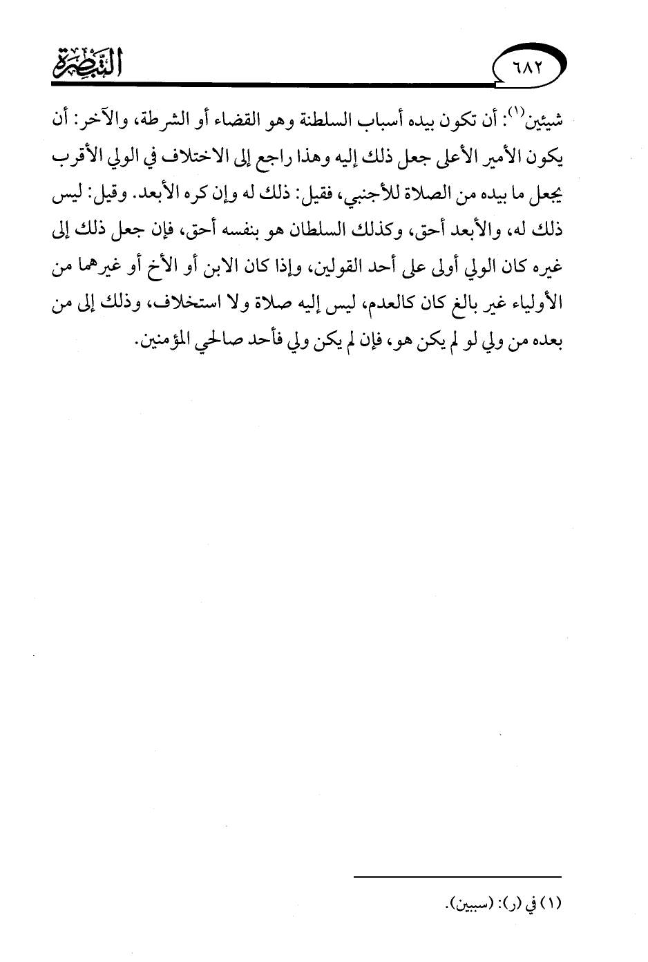 شيئين (¬1): أن تكون بيده أسباب السلطنة وهو القضاء أو الشرطة، والآخر: أن يكون الأمير الأعلى جعل ذلك إليه وهذا راجع إلى الاختلاف في الولي الأقرب يجعل ما بيده من الصلاة للأجنبي، فقيل: ذلك له وإن كره الأبعد. وقيل: ليس ذلك له، والأبعد أحق, وكذلك السلطان هو بنفسه أحق, فإن جعل ذلك إلى غيره كان الولي أولى على أحد القولين، وإذا كان الابن أو الأخ أو غيرهما من الأولياء غير بالغ كان كالعدم، ليس إليه صلاة ولا استخلاف، وذلك إلى من بعده من ولي لو لم يكن هو، فإن لم يكن ولي فأحد صالحي المؤمنين.