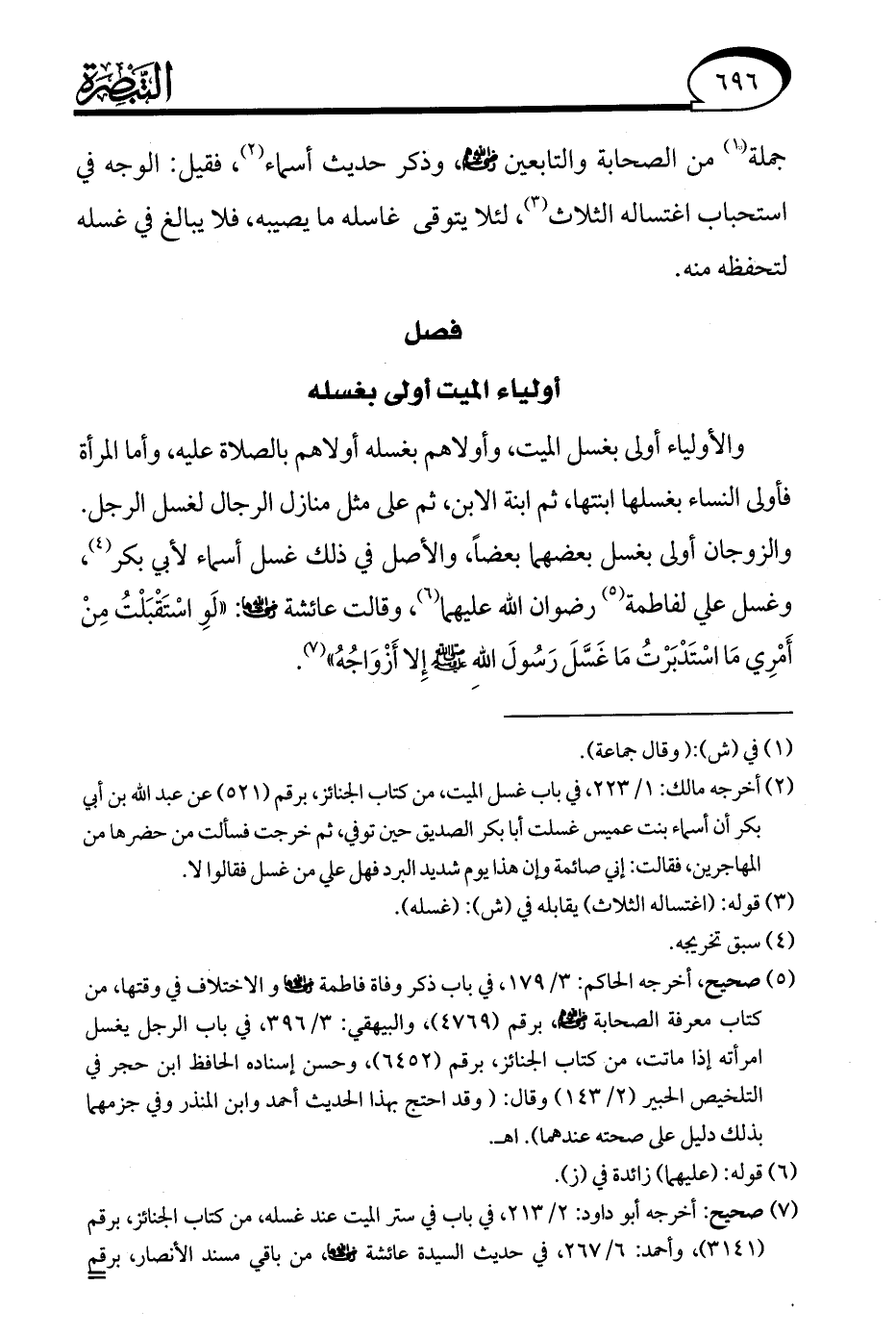 جملة (¬1) من الصحابة والتابعين - رضي الله عنهم -، وذكر حديث أسماء (¬2)، فقيل: الوجه في استحباب اغتساله الثلاث (¬3)، لئلا يتوقى غاسله ما يصيبه، فلا يبالغ في غسله لتحفظه منه.
