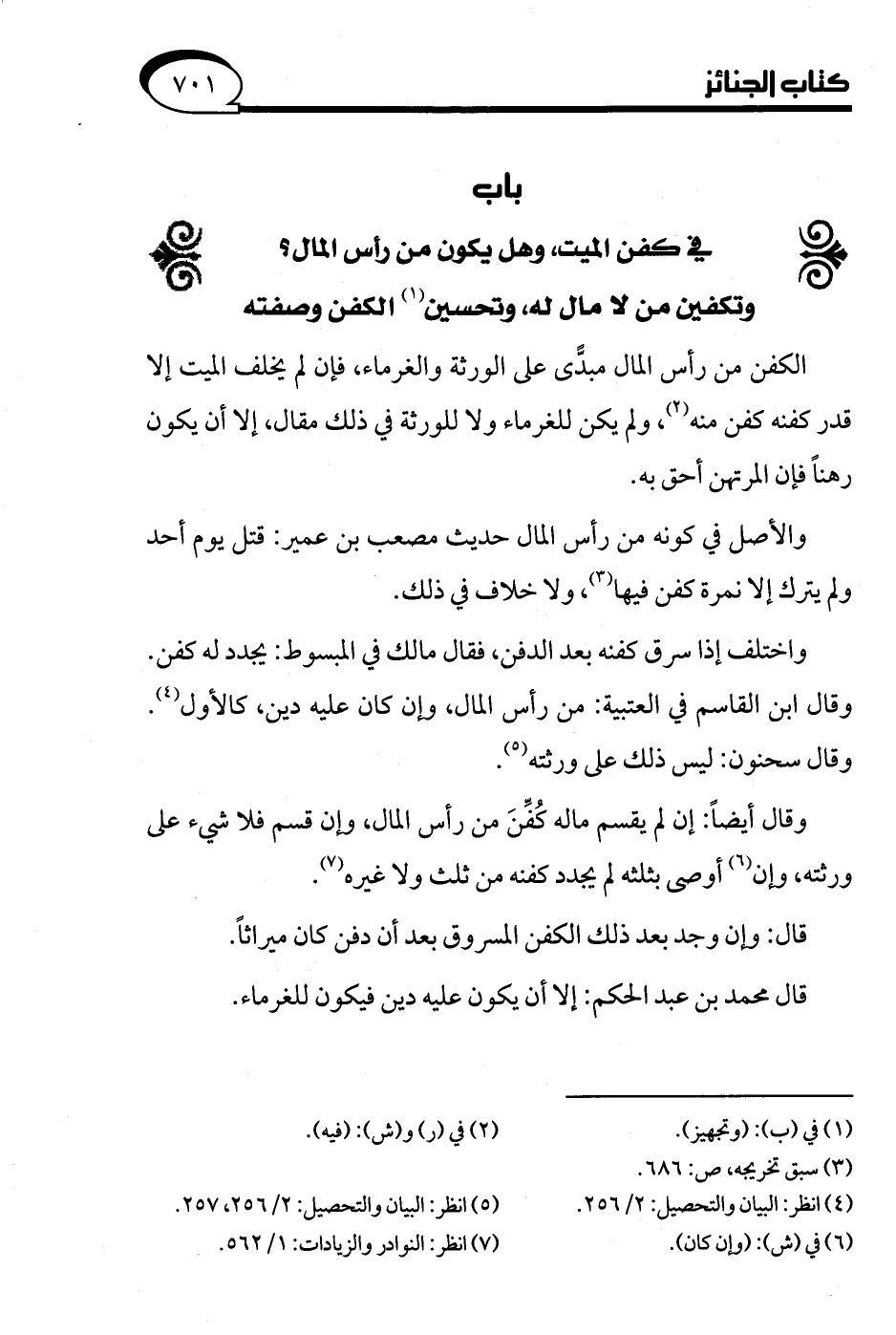 باب في كفن الميت وهل يكون من رأس المال؟ وتكفين من لا مال له وتحسين (¬1) الكفن وصفته