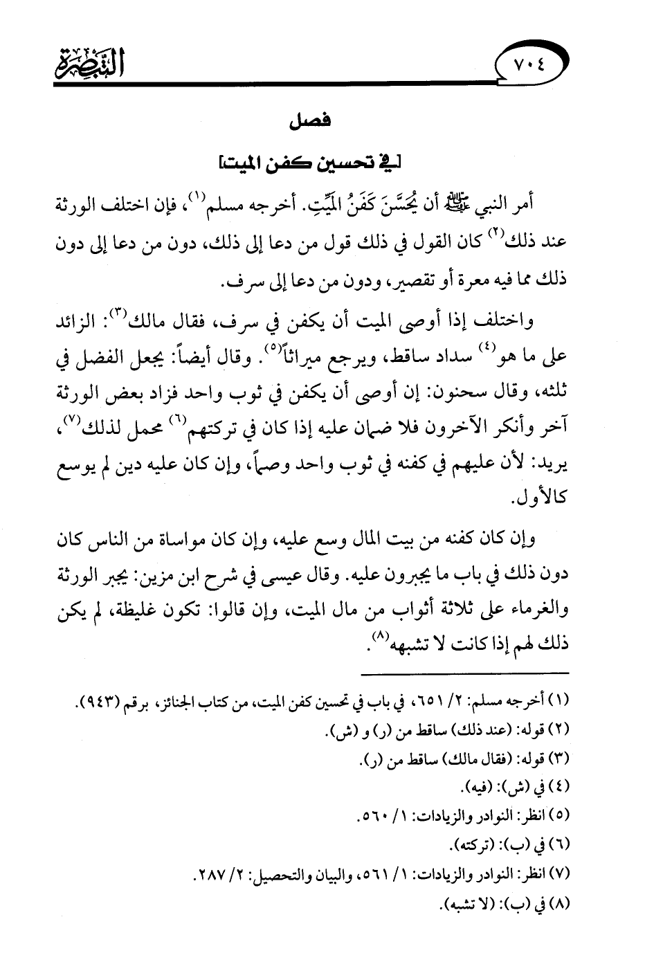أمر النبي - صلى الله عليه وسلم - أن يُحسَّنَ كَفَنُ المَيِّتِ. أخرجه مسلم (¬1)، فإن اختلف الورثة عند ذلك (¬2) كان القول في ذلك قول من دعا إلى ذلك، دون من دعا إلى دون ذلك مما فيه معرة أو تقصير، ودون من دعا إلى سرف.