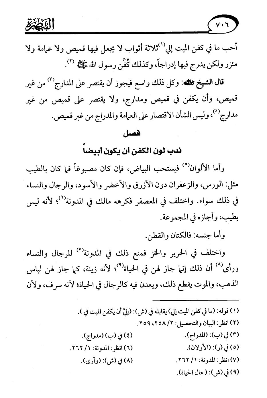 قال الشيخ - رضي الله عنه -: وكل ذلك واسع فيجوز أن يقتصر على المدارج (¬3) من غير قميص، وأن يكفن في قميص ومدارج، ولا يقتصر على قميص من غير مدارج (¬4)، وليس الشأن الاقتصار على العمامة والمدراج من غير قميص.