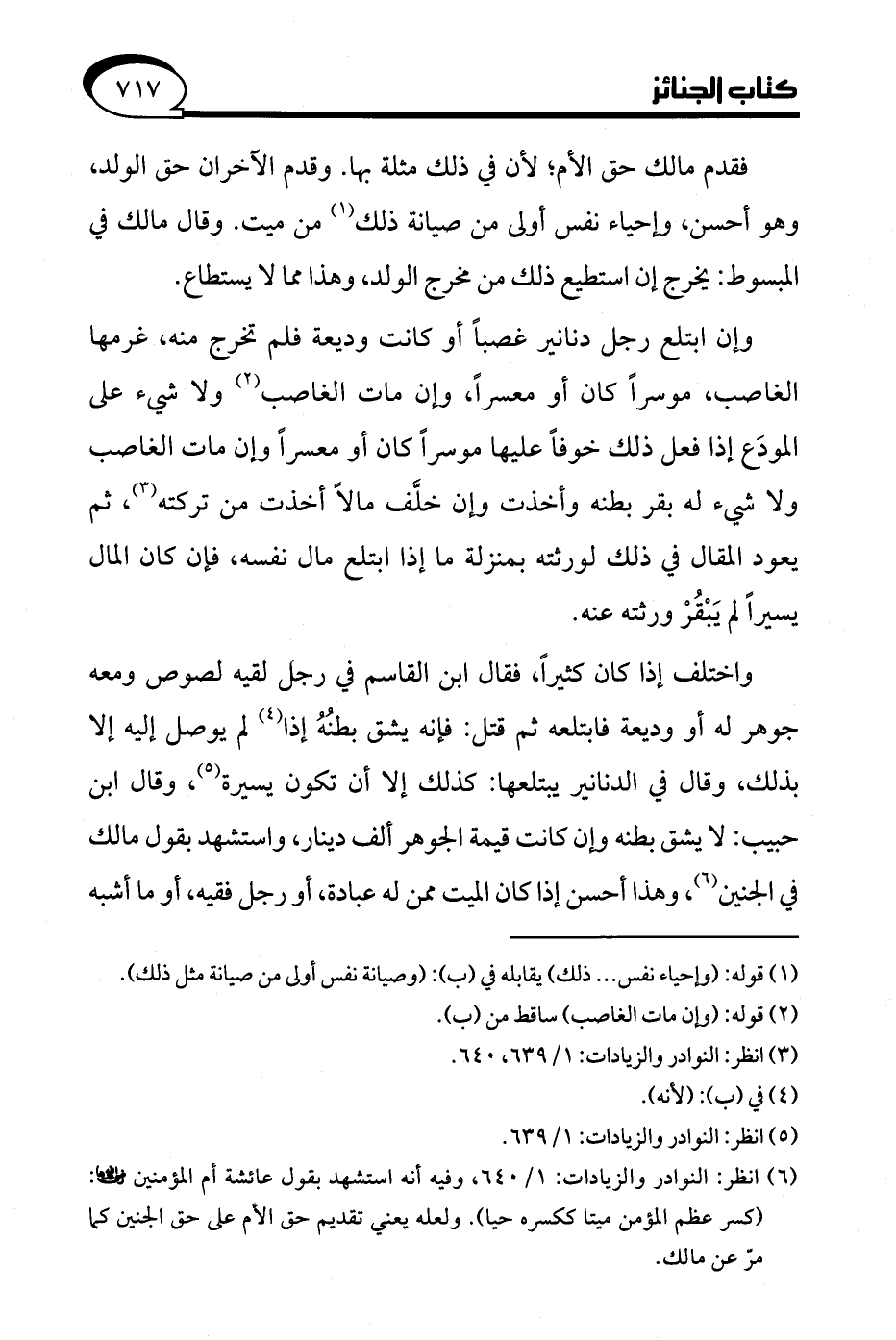(¬6) انظر: النوادر والزيادات: 1/ 640، وفيه أنه استشهد بقول عائشة أم المؤمنين - رضي الله عنها -: (كسر عظم المؤمن ميتا ككسره حيا). ولعله يعني تقديم حق الأم على حق الجنين كما مرّ عن مالك.