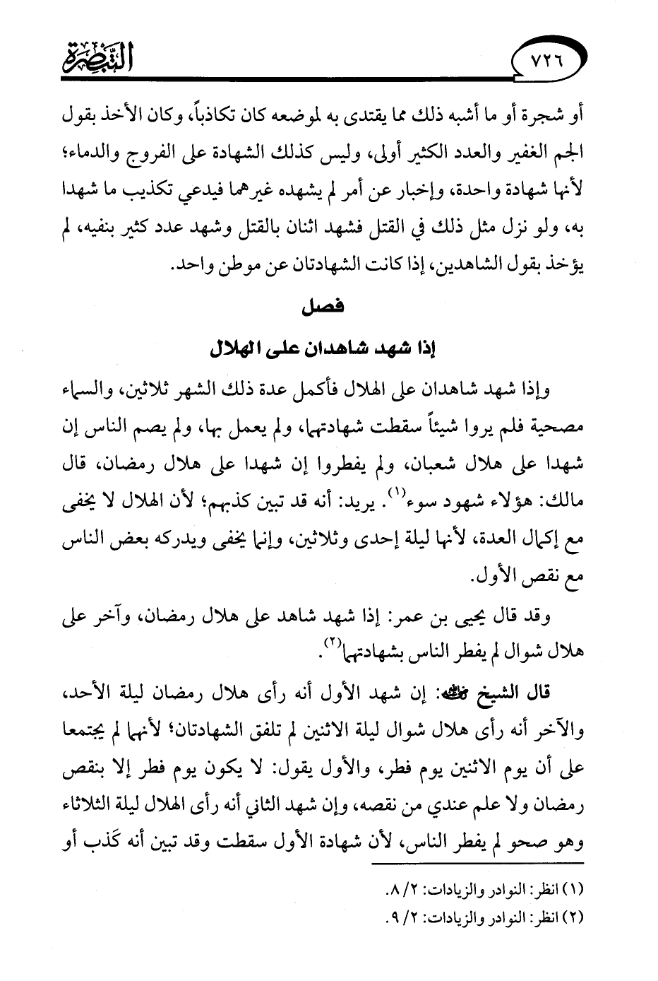 أو شجرة أو ما أشبه ذلك مما يقتدى به لموضعه كان تكاذبًا، وكان الأخذ بقول الجم الغفير والعدد الكثير أولى، وليس كذلك الشهادة على الفروج والدماء؛ لأنها شهادة واحدة، وإخبار عن أمر لم يشهده غيرهما فيدعي تكذيب ما شهدا به، ولو نزل مثل ذلك في القتل فشهد اثنان بالقتل وشهد عدد كثير بنفيه، لم يؤخذ بقول الشاهدين، إذا كانت الشهادتان عن موطن واحد.