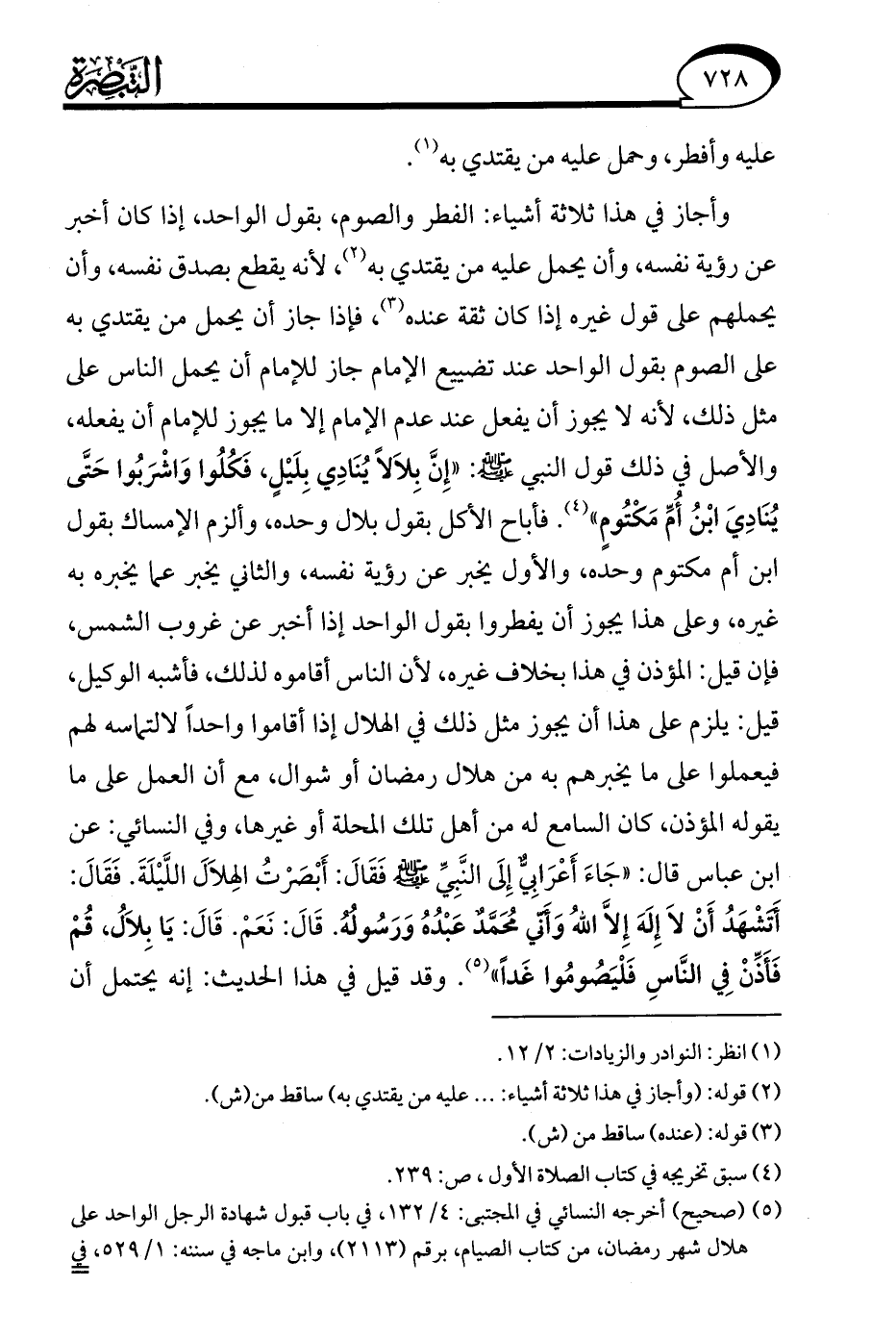 وأجاز في هذا ثلاثة أشياء: الفطر والصوم، بقول الواحد، إذا كان أخبر عن رؤية نفسه، وأن يحمل عليه من يقتدي به (¬2)؛ لأنه يقطع بصدق نفسه، وأن يحملهم على قول غيره إذا كان ثقة عنده (¬3)، فإذا جاز أن يحمل من يقتدي به على الصوم بقول الواحد عند تضييع الإمام جاز للإمام أن يحمل الناس على مثل ذلك؛ لأنه لا يجوز أن يفعل عند عدم الإمام إلا ما يجوز للإمام أن يفعله، والأصل في ذلك قول النبي - صلى الله عليه وسلم -: "إِنَّ بِلاَلًا يُنَادِي بِلَيْلٍ، فَكُلُوا وَاشْرَبُوا حَتَّى يُنَادِيَ ابْنُ أُمِّ مَكْتُومٍ" (¬4). فأباح الأكل بقول بلال وحده، وألزم الإمساك بقول ابن أم مكتوم وحده، والأول يخبر عن رؤية نفسه، والثاني يخبر عما يخبره به غيره، وعلى هذا يجوز أن يفطروا بقول الواحد إذا أخبر عن غروب الشمس، فإن قيل: المؤذن في هذا بخلاف غيره؛ لأن الناس أقاموه لذلك، فأشبه الوكيل، قيل: يلزم على هذا أن يجوز مثل ذلك في الهلال إذا أقاموا واحدًا لالتماسه لهم فيعملوا على ما يخبرهم به من هلال رمضان أو شوال، مع أن العمل على ما يقوله المؤذن، كان السامع له من أهل تلك المحلة أو غيرها، وفي النسائي: عن ابن عباس قال: "جَاءَ أَعْرَابِيٌّ إِلَى النَّبِيِّ - صلى الله عليه وسلم - فَقَالَ: أَبْصَرْتُ الهِلاَلَ اللَّيْلَةَ. فَقَالَ: أَتَشْهَدُ أَنْ لاَ إِلَهَ إِلاَّ اللهُ وَأَنّي مُحَمَّدٌ عَبْدُهُ وَرَسُولُهُ. قَالَ: نَعَمْ. قَالَ: يَا بِلاَلُ، قُمْ فَأَذِّنْ فِي النَّاسِ فَلْيَصُومُوا غَدًا" (¬5). وقد قيل في هذا الحديث: إنه يحتمل أن