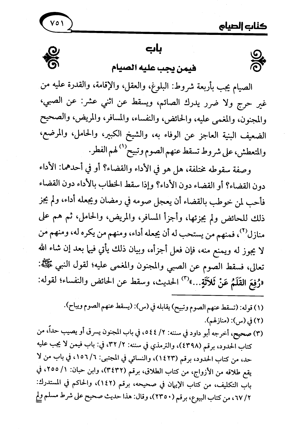 وصفة سقوطه مختلفة، هل هو في الأداء والقضاء؟ أو في أحدهما: الأداء دون القضاء؟ أو القضاء دون الأداء؟ وإذا سقط الخطاب بالأداء دون القضاء فأحب لمن خوطب بالقضاء أن يعجل صومه في رمضان ويجعله أداء، ولم يجز ذلك للحائض ولم يجزئها، وأجزأ المسافر، والمريض، والحامل، ثم هم على منازل (¬2)، فمنهم من يستحب له أن يجعله أداء، ومنهم من يكره له، ومنهم من لا يجوز له ويمنع منه، فإن فعل أجزأه، وبيان ذلك يأتي فيما بعد إن شاء الله تعالى، فسقط الصوم عن الصبي والمجنون والمغمى عليه؛ لقول النبي - صلى الله عليه وسلم -: "رُفِعَ القَلَمُ عَنْ ثَلَاثَةٍ. . ." (¬3) الحديث، وسقط عن الحائض والنفساء؛ لقوله: