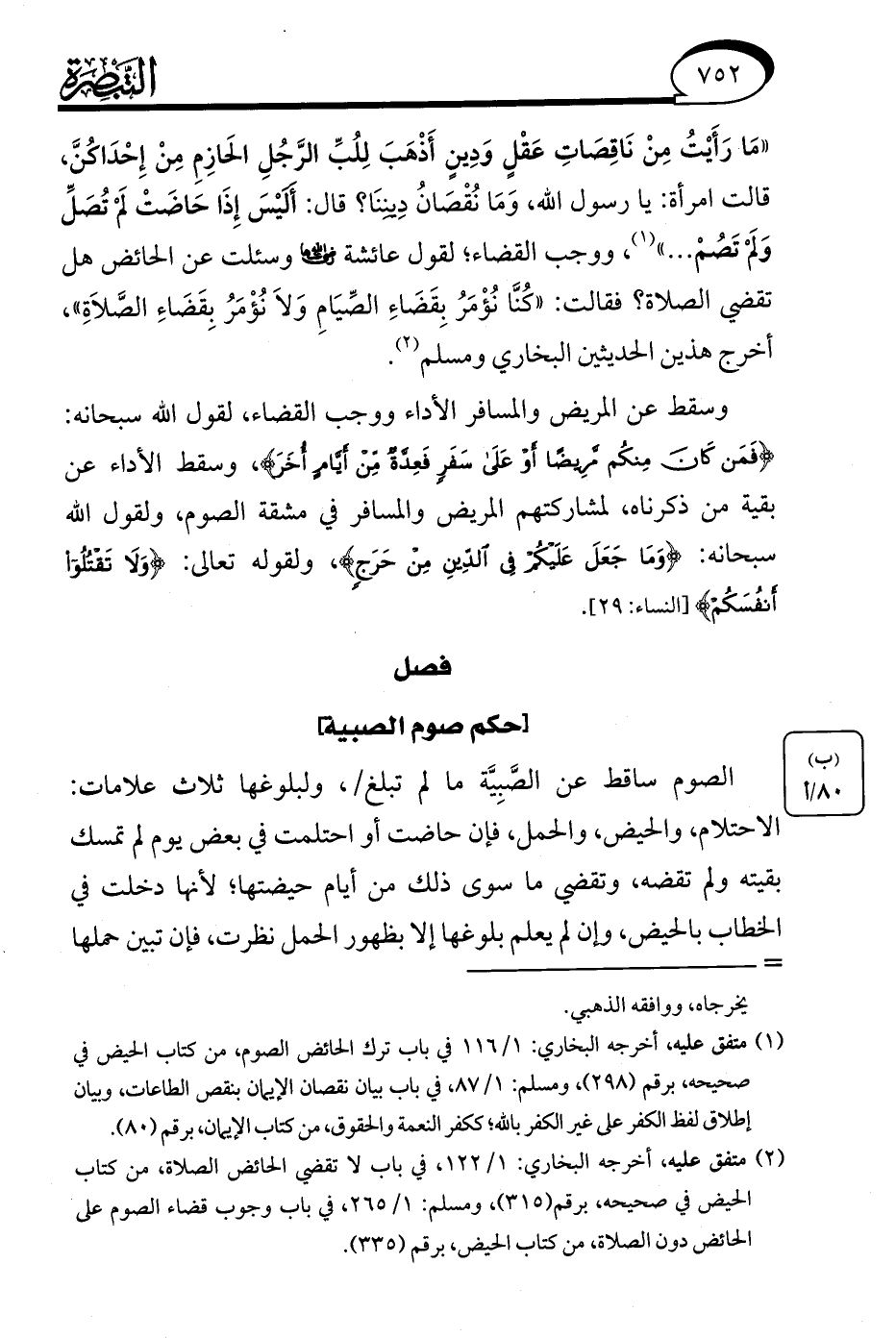 (¬1) متفق عليه، أخرجه البخاري: 1/ 116 في باب ترك الحائض الصوم، من كتاب الحيض في صحيحه، برقم (298)، ومسلم: 1/ 87 , في باب بيان نقصان الإيمان بنقص الطاعات, وبيان إطلاق لفظ الكفر على غير الكفر بالله؛ ككفر النعمة والحقوق, من كتاب الإيمان, برقم (80).
