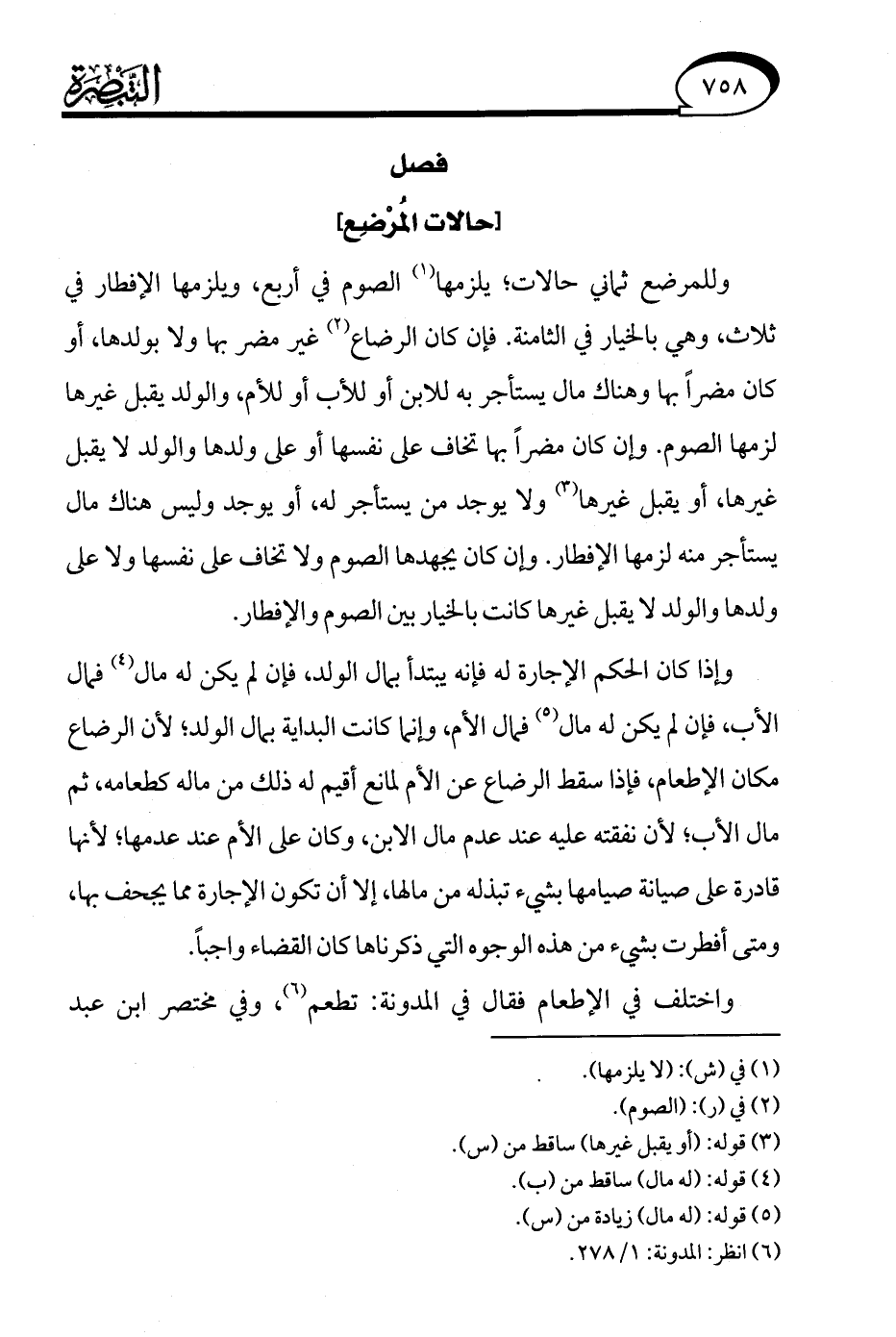 وللمرضع ثماني حالات؛ يلزمها (¬1) الصوم في أربع، ويلزمها الإفطار في ثلاث، وهي بالخيار في الثامنة. فإن كان الرضاع (¬2) غير مضر بها ولا بولدها، أو كان مضرًا بها وهناك مال يستأجر به للابن أو للأب أو للأم، والولد يقبل غيرها لزمها الصوم. وإن كان مضرًا بها تخاف على نفسها أو على ولدها والولد لا يقبل غيرها، أو يقبل غيرها (¬3) ولا يوجد من يستأجر له، أو يوجد وليس هناك مال يستأجر منه لزمها الإفطار. وإن كان يجهدها الصوم ولا تخاف على نفسها ولا على ولدها والولد لا يقبل غيرها كانت بالخيار بين الصوم والإفطار.