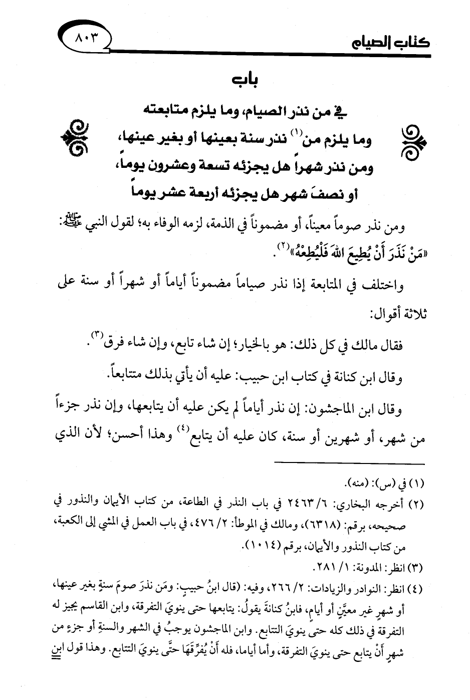 (¬4) انظر: النوادر والزيادات: 2/ 266، وفيه: (قال ابنُ حبيبٍ: ومَن نذرَ صومَ سنةٍ بغير عينها، أو شهرٍ غير معيَّنٍ أو أيامٍ، فابنُ كنانةَ يقولُ: يتابعها حتى ينويَ التفرقة, وابن القاسم يجيز له التفرقة في ذلك كله حتى ينويَ التتابع. وابن الماجشون يوجبُ في الشهر والسنةِ أو جزءٍ من شهرٍ أَنْ يتابع حتى ينويَ التفرقة, وأما أياما، فله أَنْ يُفرِّقَهَا حتَّى ينويَ التتابع. وهذا قول ابن =