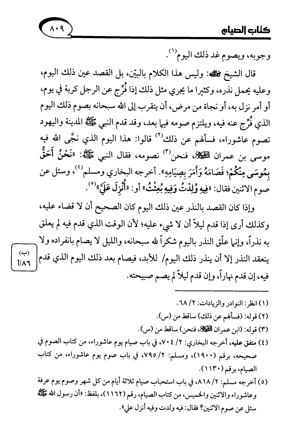 قال الشيخ - رضي الله عنه -: وليس هذا الكلام بالبيّن، بل القصد عين ذلك اليوم، وعليه يحمل نذره, وكثيرا ما يجري مثل ذلك إذا فُرِّج عن الرجل كربة في يوم، أو أمر نزل به، أو نجاة من مرض، أن يتقرب إلى الله سبحانه بصوم ذلك اليوم الذي فُرِّج عنه فيه، ويلتزم صومه فيما بعد، وقد قدم النبي - صلى الله عليه وسلم - المدينة واليهود تصوم عاشوراء، فسألهم عن ذلك (¬2) قالوا: هذا اليوم الذي نجَّى الله فيه موسى بن عمران - عليه السلام -، فنحن (¬3) نصومه، فقال النبي - صلى الله عليه وسلم -: "نَحْنُ أَحَقُّ بِمُوسَى مِنْكُمْ؛ فَصَامَهُ وَأَمَرَ بِصِيَامِهِ". أخرجه البخاري ومسلم (¬4)، وسئل عن صوم الاثنين فقال: "فِيهِ وُلِدْتُ وَفِيهِ بُعِثْتُ" أو: "أُنْزِلَ عَلَيَّ" (¬5).