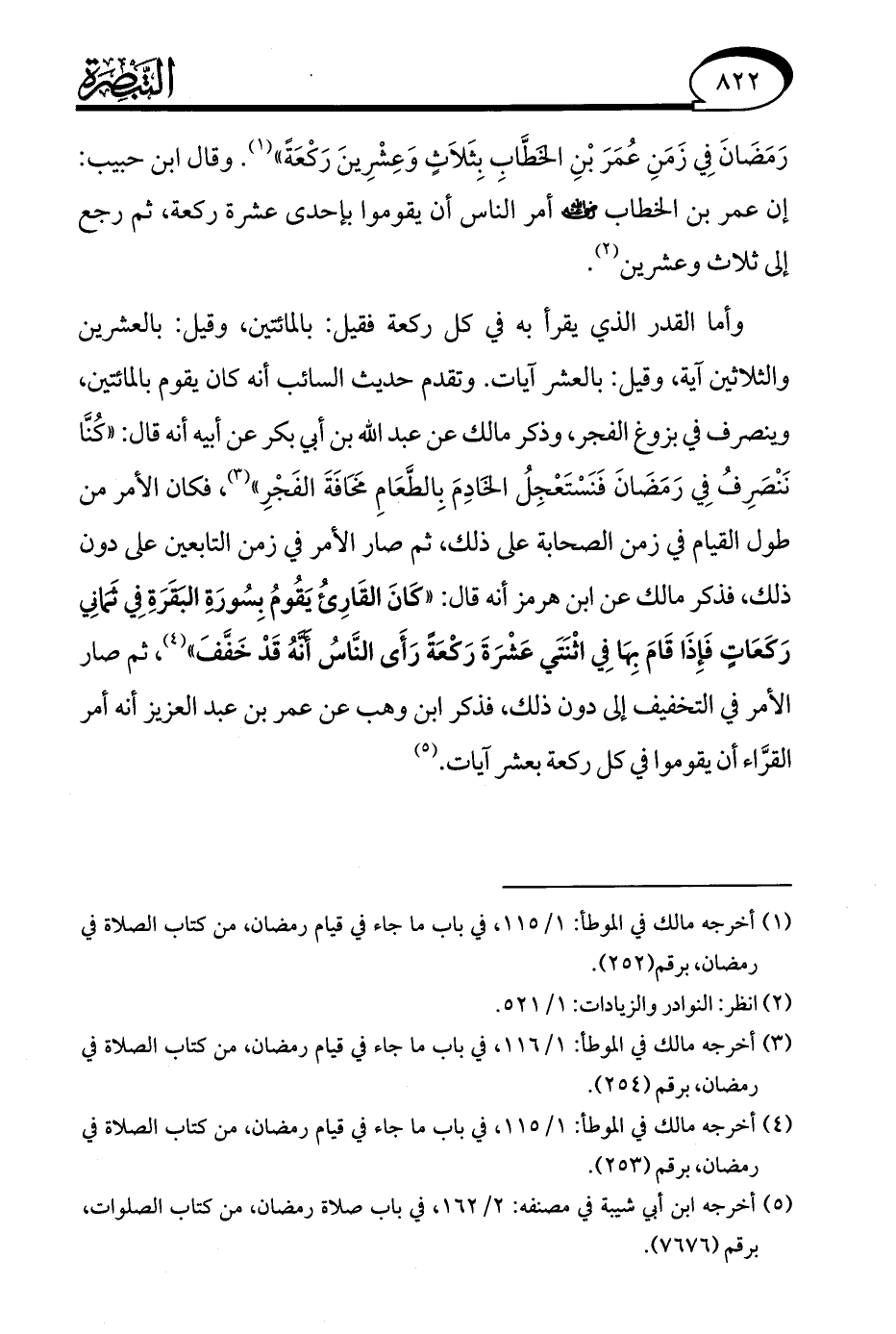 رَمَضَانَ فِي زَمَنِ عُمَرَ بْنِ الخَطَّابِ بِثَلاَثٍ وَعِشْرِينَ رَكْعَةً" (¬1). وقال ابن حبيب: إن عمر بن الخطاب - رضي الله عنه - أمر الناس أن يقوموا بإحدى عشرة ركعة، ثم رجع إلى ثلاث وعشرين (¬2).
