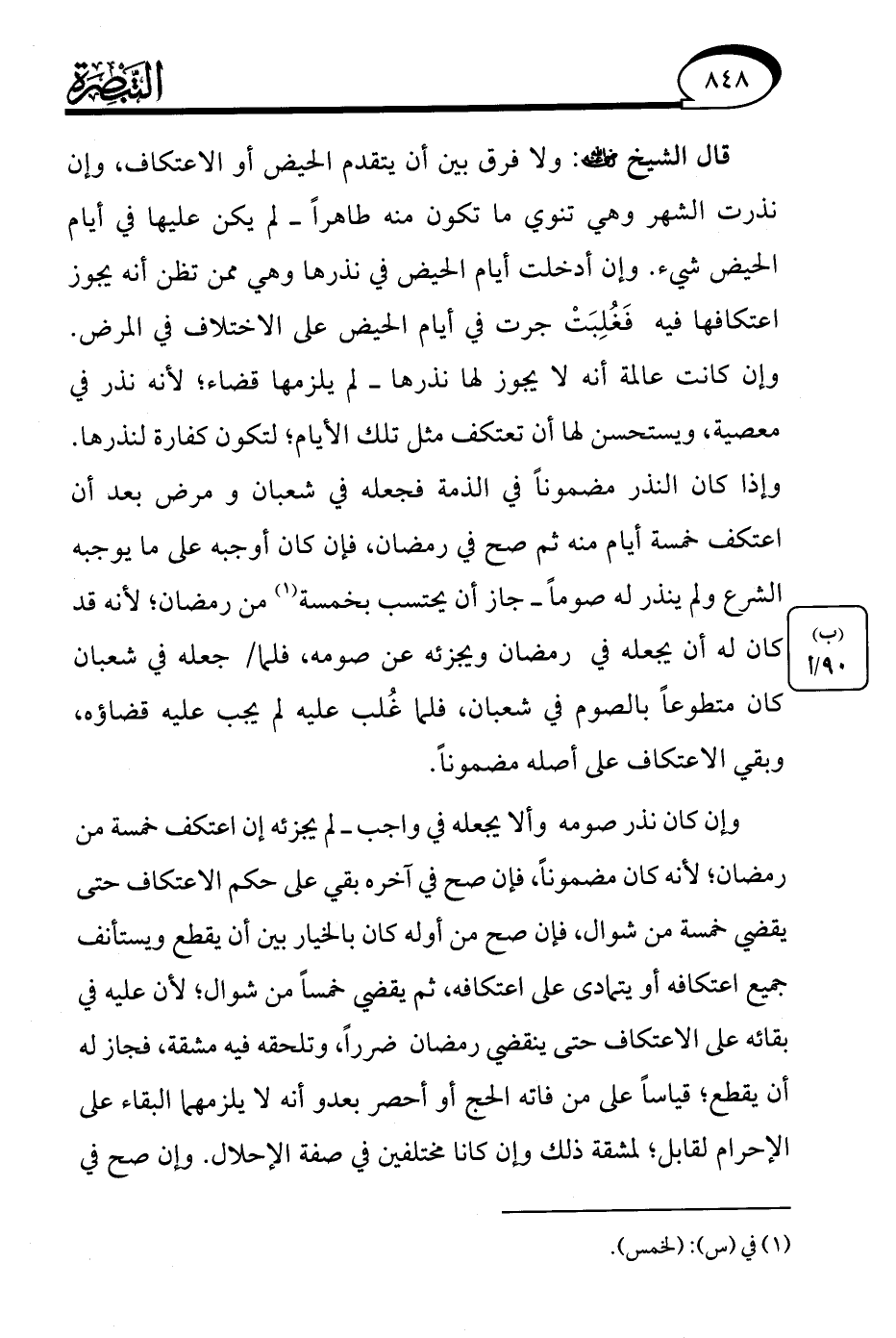 قال الشيخ - رضي الله عنه -: ولا فرق بين أن يتقدم الحيض أو الاعتكاف، وإن نذرت الشهر وهي تنوي ما تكون منه طاهرًا- لم يكن عليها في أيام الحيض شيء. وإن أدخلت أيام الحيض في نذرها وهي ممن تظن أنه يجوز اعتكافها فيه فَغُلِبَتْ جرت في أيام الحيض على الاختلاف في المرض. وإن كانت عالمة أنه لا يجوز لها نذرها- لم يلزمها قضاء؛ لأنه نذر في معصية، ويستحسن لها أن تعتكف مثل تلك الأيام؛ لتكون كفارة لنذرها. وإذا كان النذر مضمونًا في الذمة فجعله في شعبان ومرض بعد أن اعتكف خمسة أيام منه ثم صح في رمضان، فإن كان أوجبه على ما يوجبه الشرع ولم ينذر له صومًا- جاز أن يحتسب بخمسة (¬1) من رمضان؛ لأنه قد كان له أن يجعله في رمضان ويجزئه عن صومه، فلما جعله في شعبان كان متطوعًا بالصوم في شعبان، فلما غُلب عليه لم يجب عليه قضاؤه، وبقي الاعتكاف على أصله مضمونًا.
